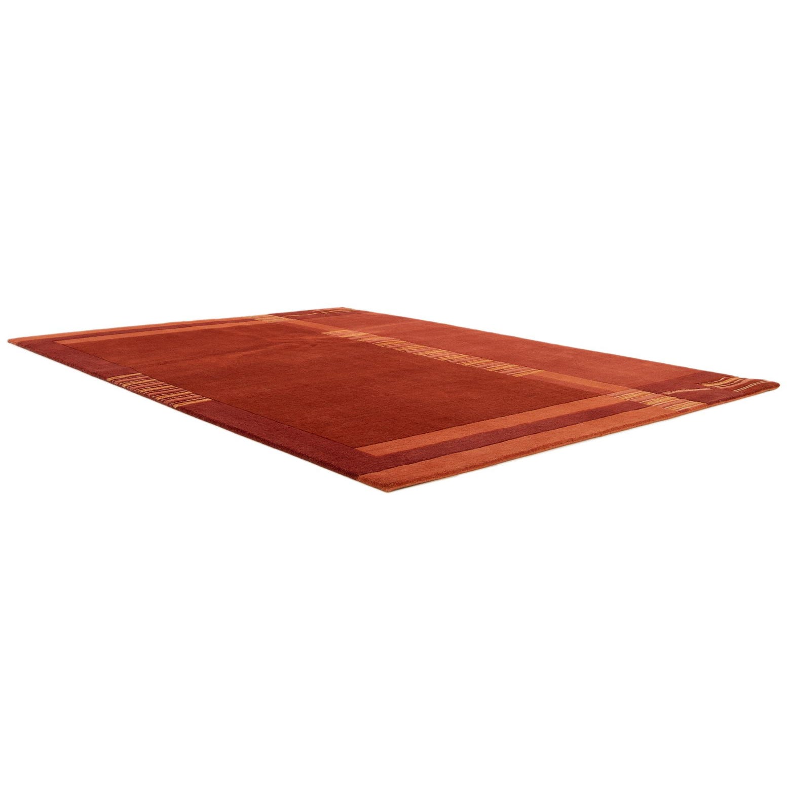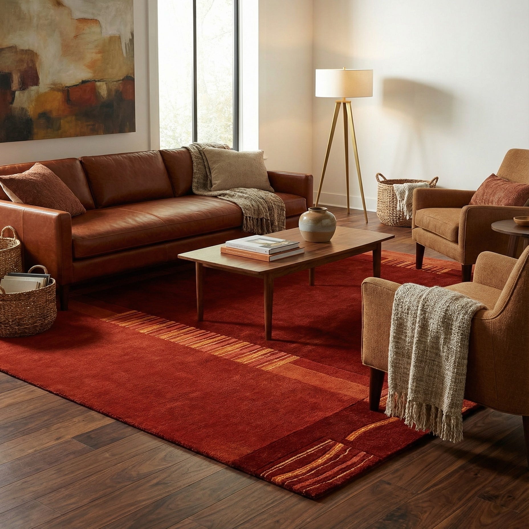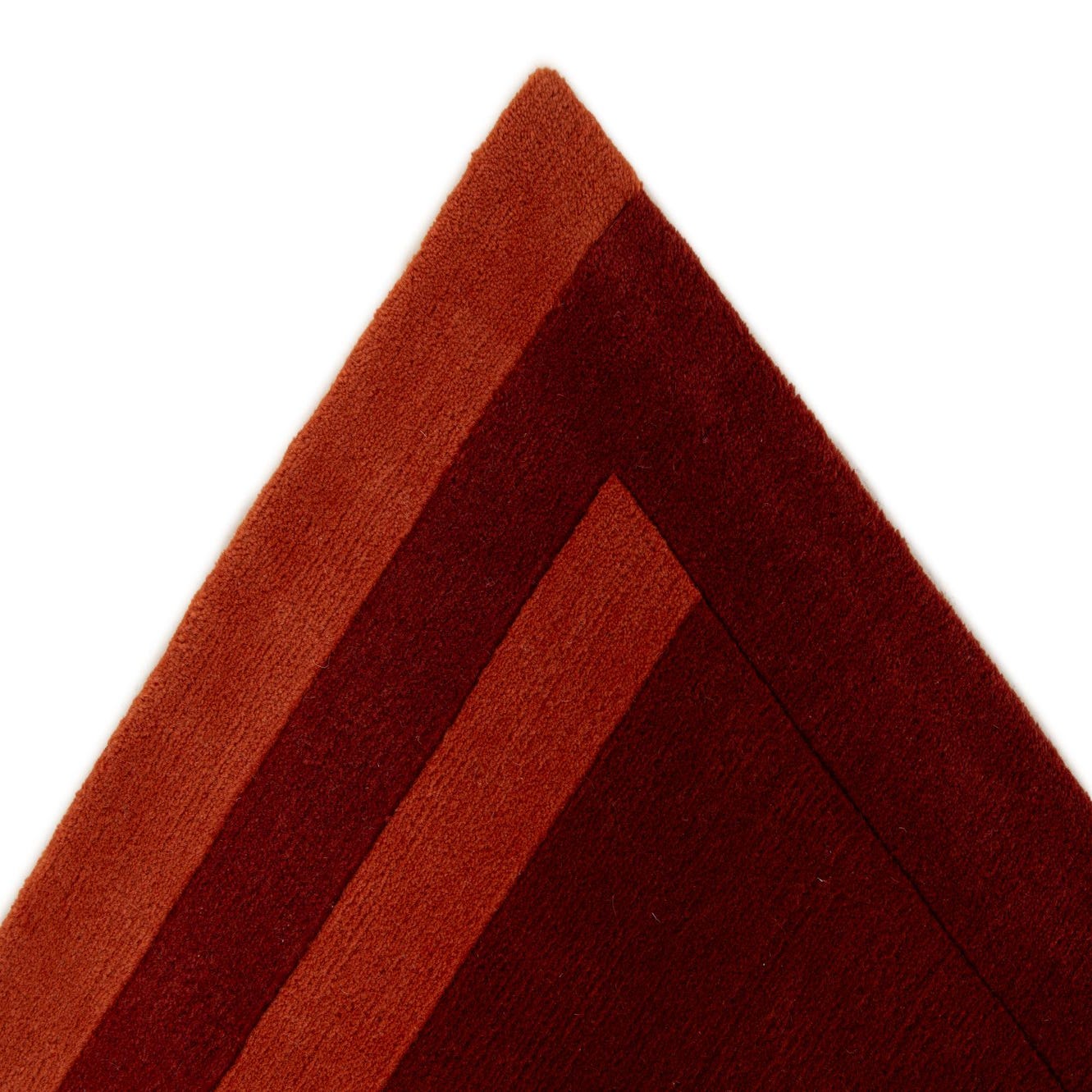 A 4x6 rectangular Nepal Collection rug in deep red and orange with a modern abstract design and striped accents.