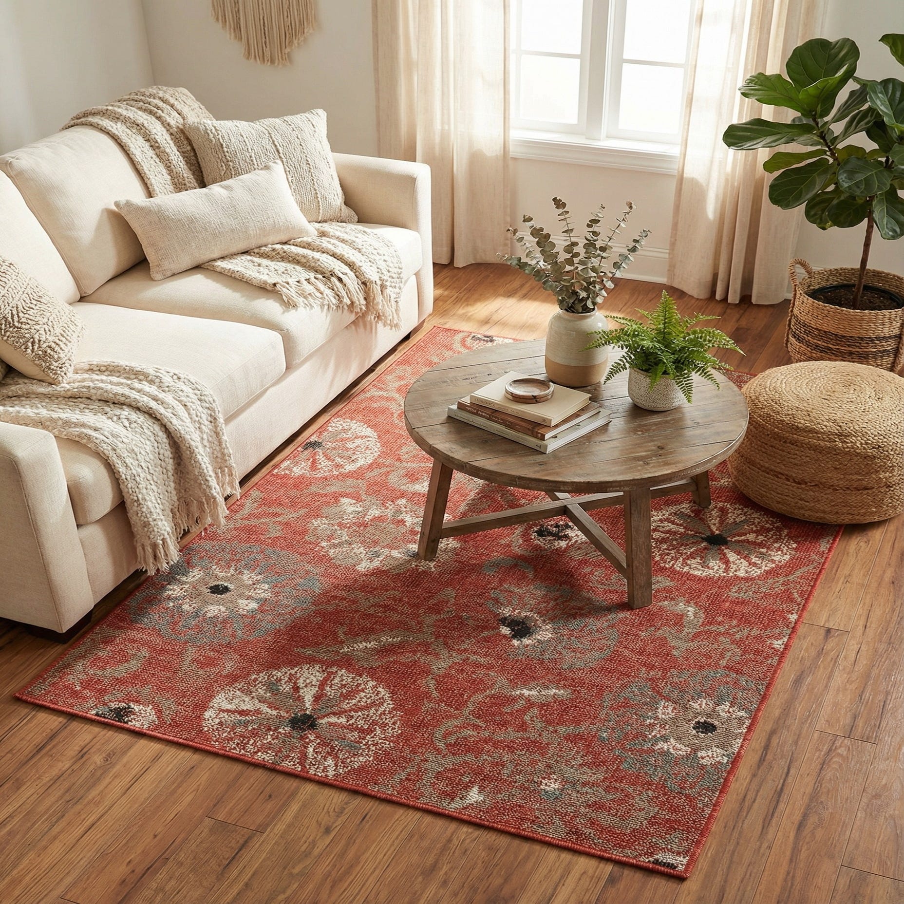 This rug works well on a covered patio or sunroom layered beneath a small bistro set, and it also gives an entryway or kitchen a welcoming wash of color. Pair it with rattan or warm wood furniture and neutral linens for a relaxed, southwestern or boho look, or use it to bring warmth to a casual living area with blue or ivory accents. Its construction makes it appropriate for high-traffic spots where you want a decorative, grounded element without a high-profile pile.