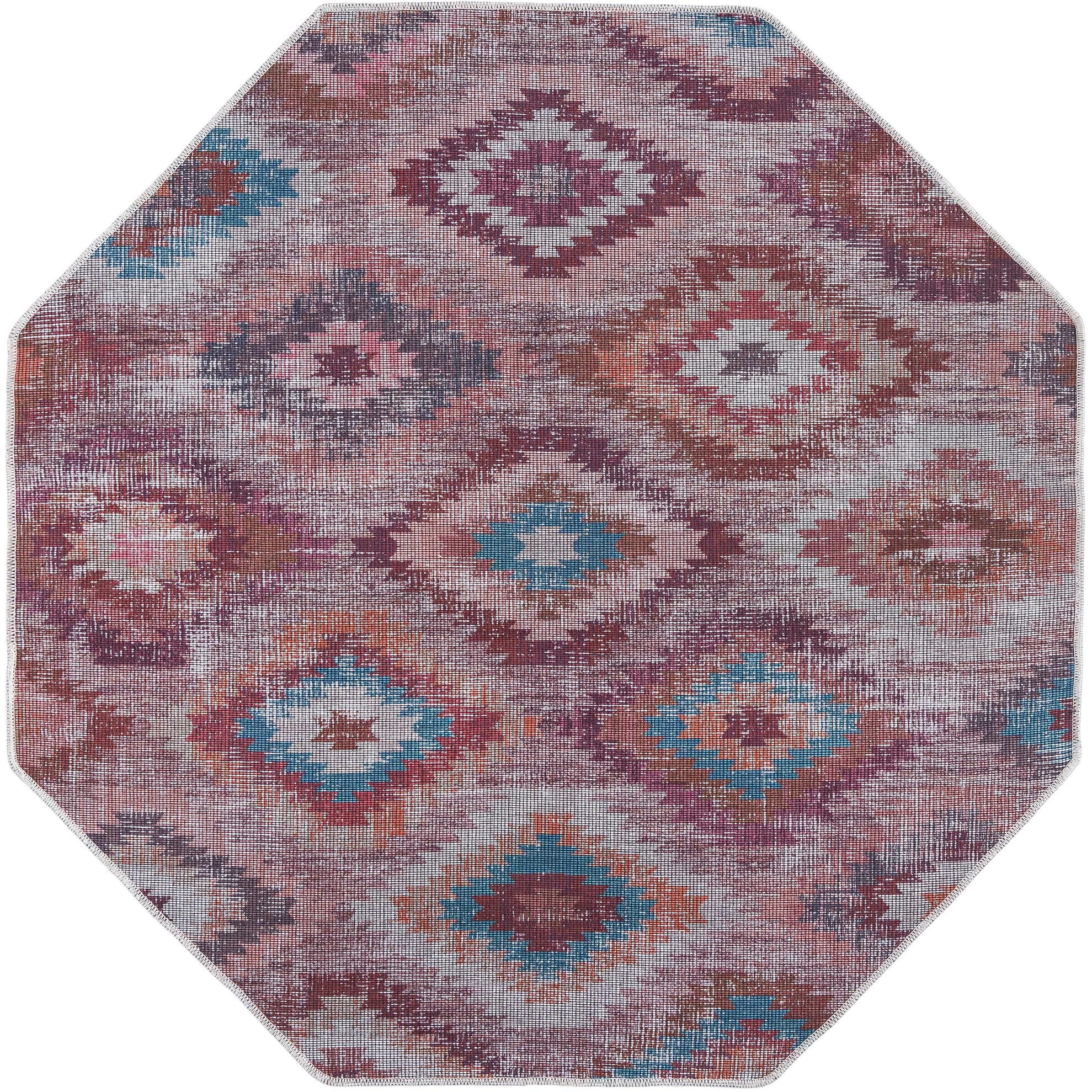 Octagon-shaped Sisu rug, 5'3" x 5'3", featuring a distressed Southwestern tribal pattern in oranges, reds, and blues on a light background.