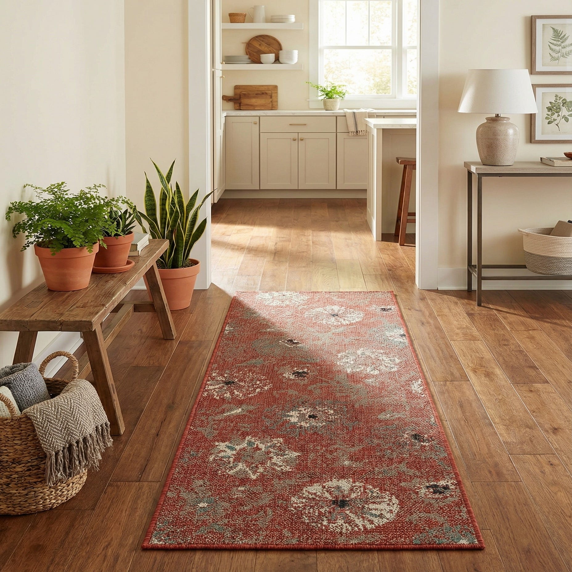 Machine-made from 100% polypropylene, the runner has a low-profile, tightly woven surface with a slight nubby texture that feels sturdy underfoot and lays flat in narrow spaces. Place it in hallways, entryways, a kitchen aisle, or on a covered porch to introduce color and pattern. It pairs nicely with warm wood tones, rattan furniture, or neutral linens and complements rustic, farmhouse, coastal, or bohemian interiors.