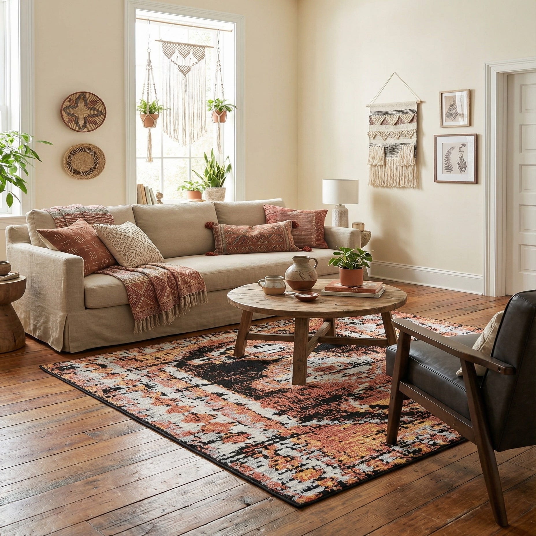 Machine-made from 100% polyester, the pile is soft underfoot with a subtle luster and a gently textured hand from varied tufting. The color palette and worn aesthetic pair especially well with warm wood tones, matte black metal, and natural linens; try it with a neutral sofa and leather accent chair for a layered look, place it in a bedroom to add warmth at the foot of the bed, or use it to ground a small seating area or entry where color and pattern can make a stylish first impression.