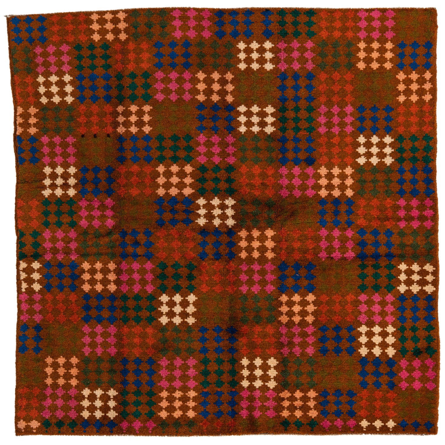 Hand-knotted in 100% wool, the rug has a dense, low-to-medium pile with a pleasantly textured, slightly nubby hand that invites touch and holds color richly. Place it under a low coffee table to anchor a living room, layer it in a cozy reading nook to add warmth, or position it at the foot of a bed to introduce pattern and color to a neutral bedroom. It pairs particularly well with warm woods, leather seating, and eclectic or southwestern-inspired decor where terracotta and olive tones complement natural materials.