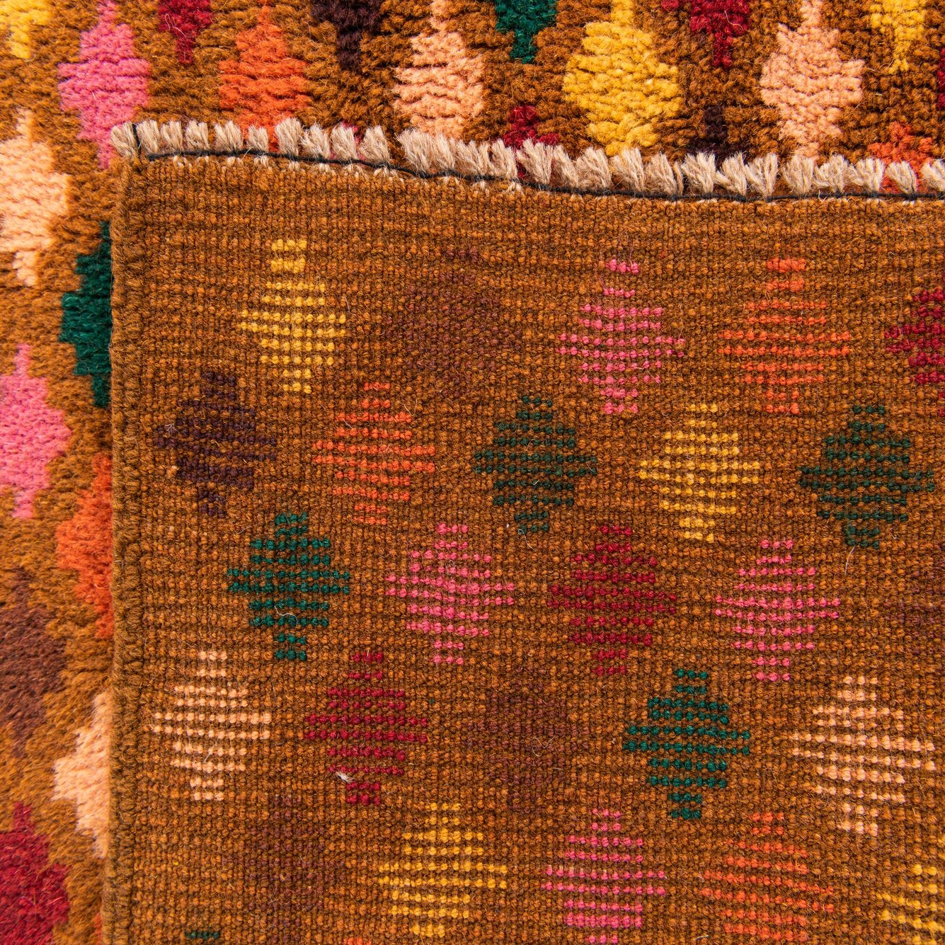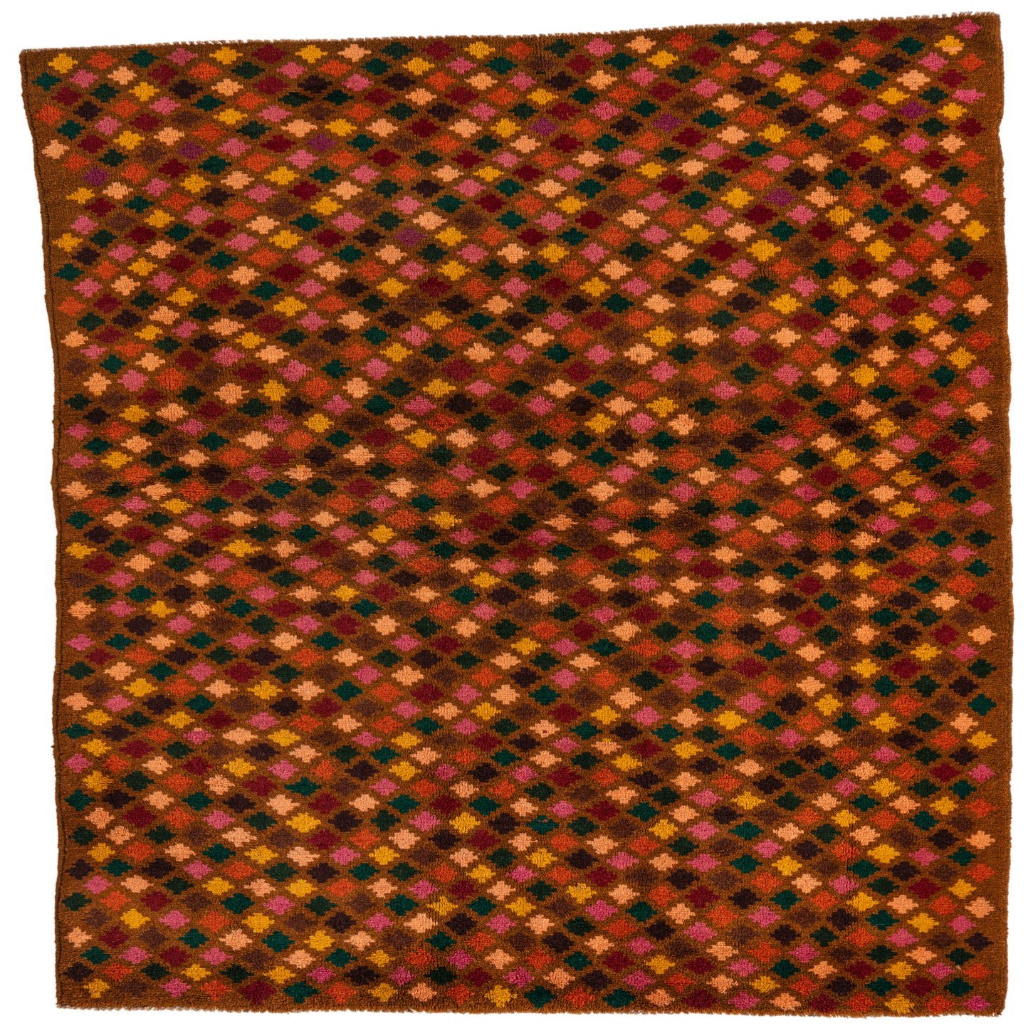 A 5x7 rectangular Balouch rug with a traditional tribal pattern of small, colorful diamonds in oranges, reds, yellows, pinks, and greens on a brown background.