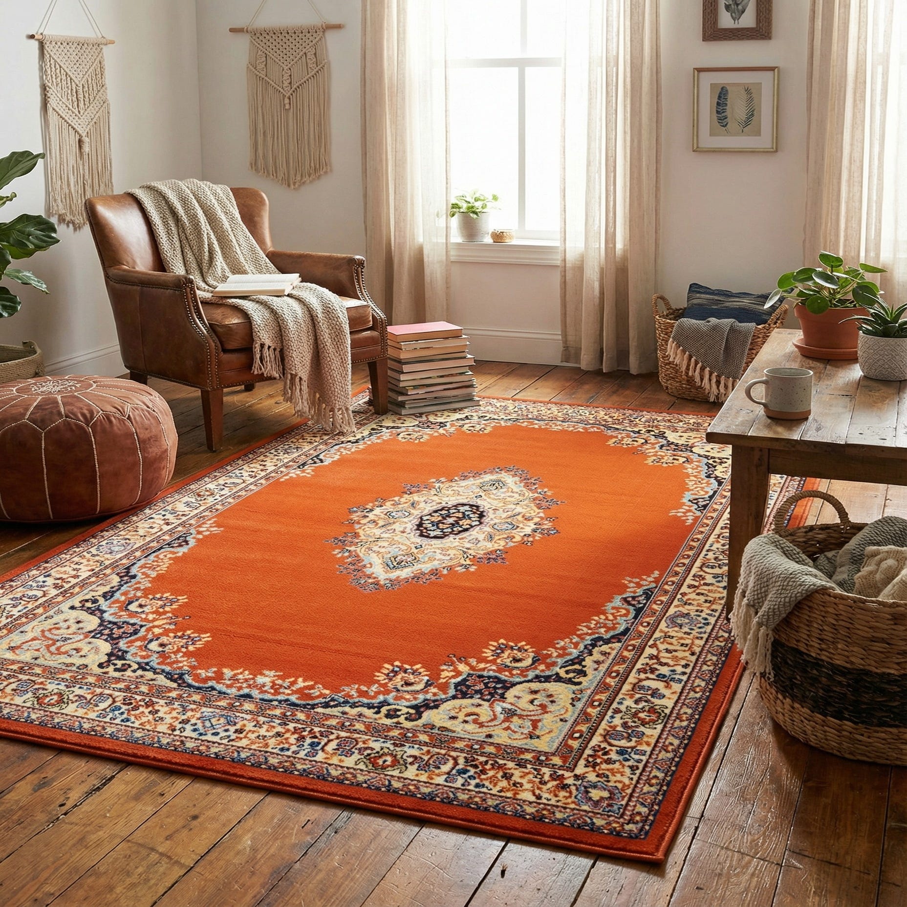 Machine-made from 100% polypropylene, the rug has a low, even pile that feels smooth and slightly cushioned underfoot. The surface offers a softly dense hand that works well in everyday spaces. Style-wise it pairs naturally with warm wood furniture, leather sofas and cream upholstery for a classic living room, and it complements coastal or transitional interiors when coordinated with light blue accents. It also fits well in an entryway or dining area where a bold ground color and a defined border help anchor furniture and define the space.