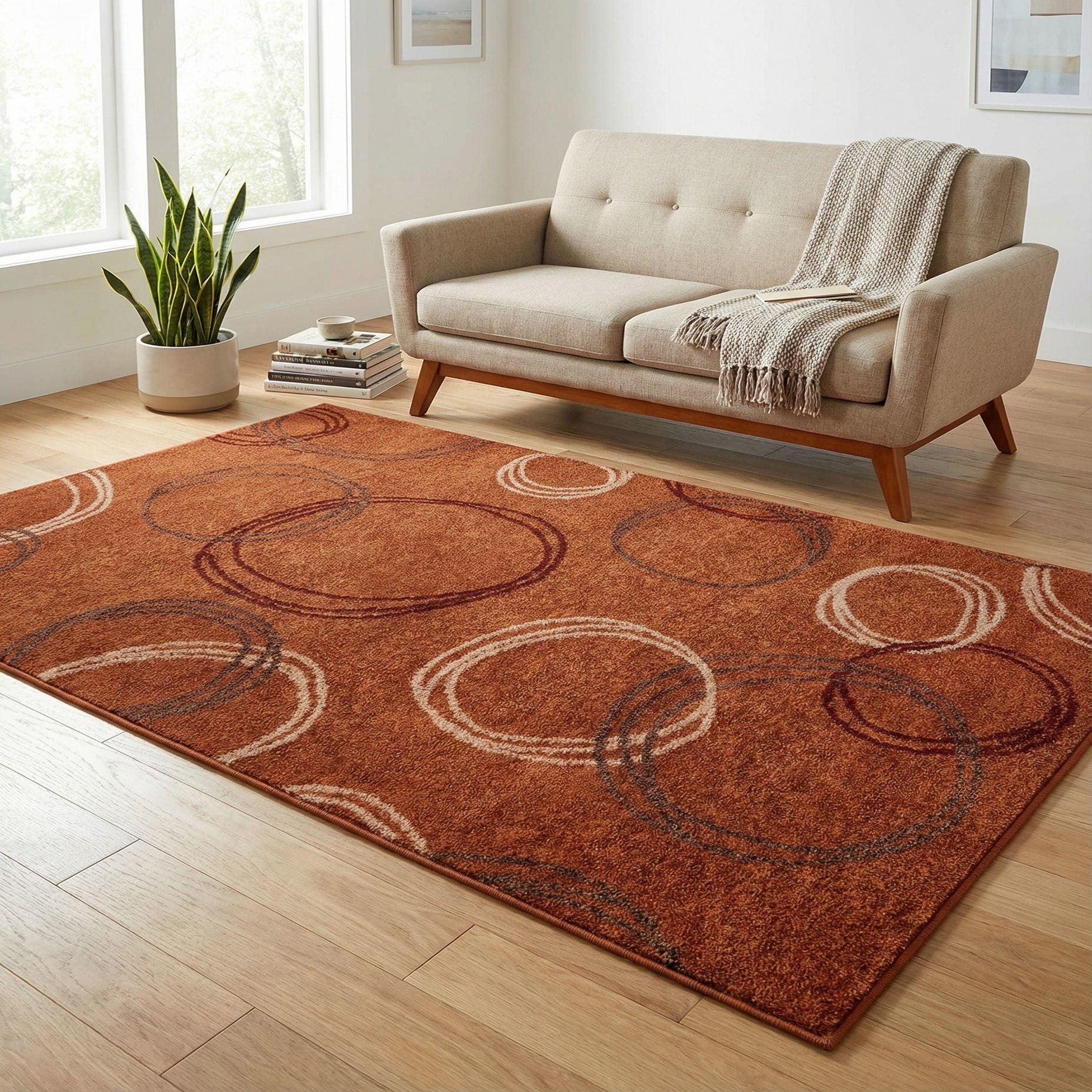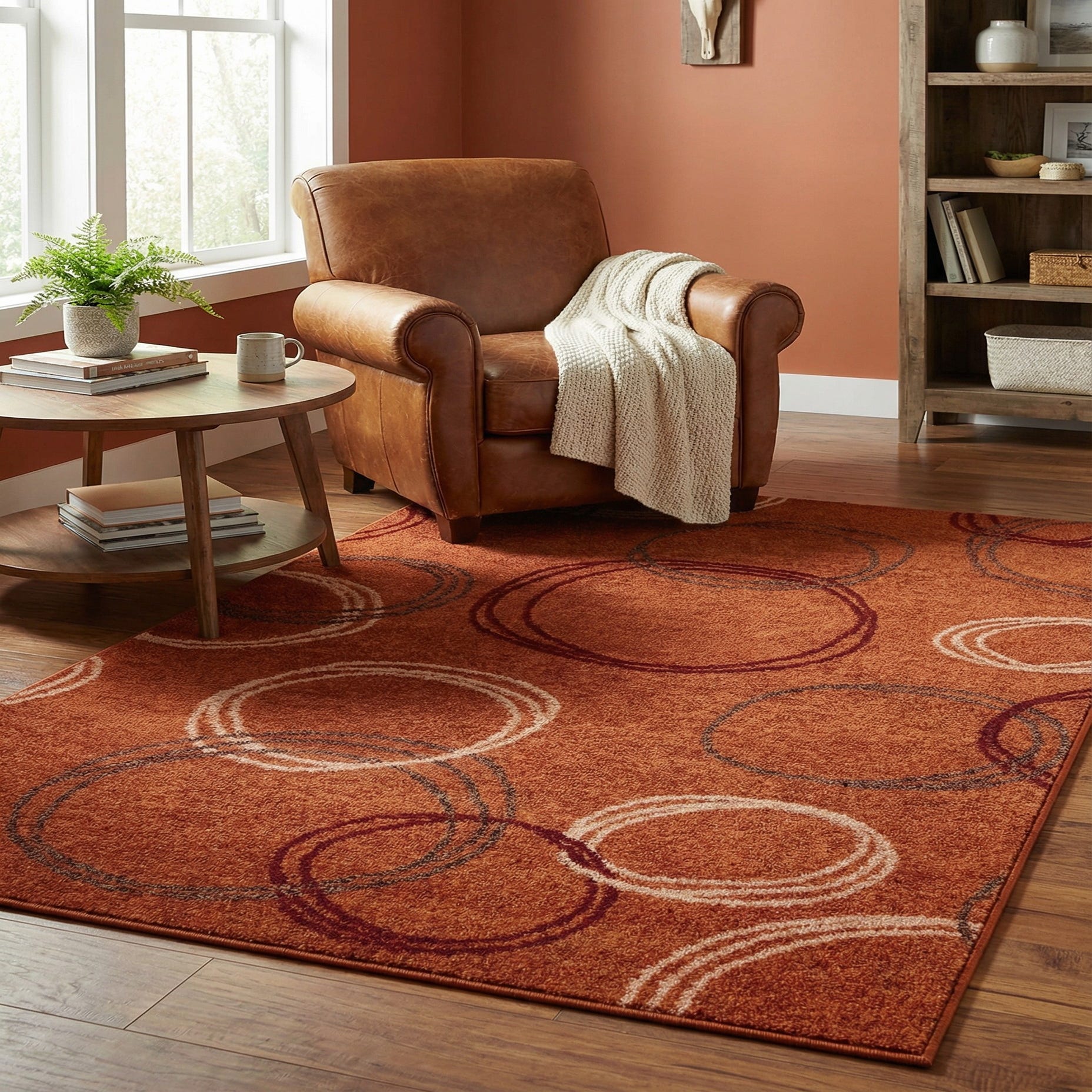 A warm terracotta field provides the backdrop for a lively, modern loop motif rendered in beige, brown and burgundy. Overlapping, hand-drawn concentric circles of varying scale create movement across the surface, giving the rug a contemporary geometric feel with a casual, drawn-by-hand character. The color palette leans toward warm, earthy tones that anchor a room while the darker rings add depth and visual contrast.