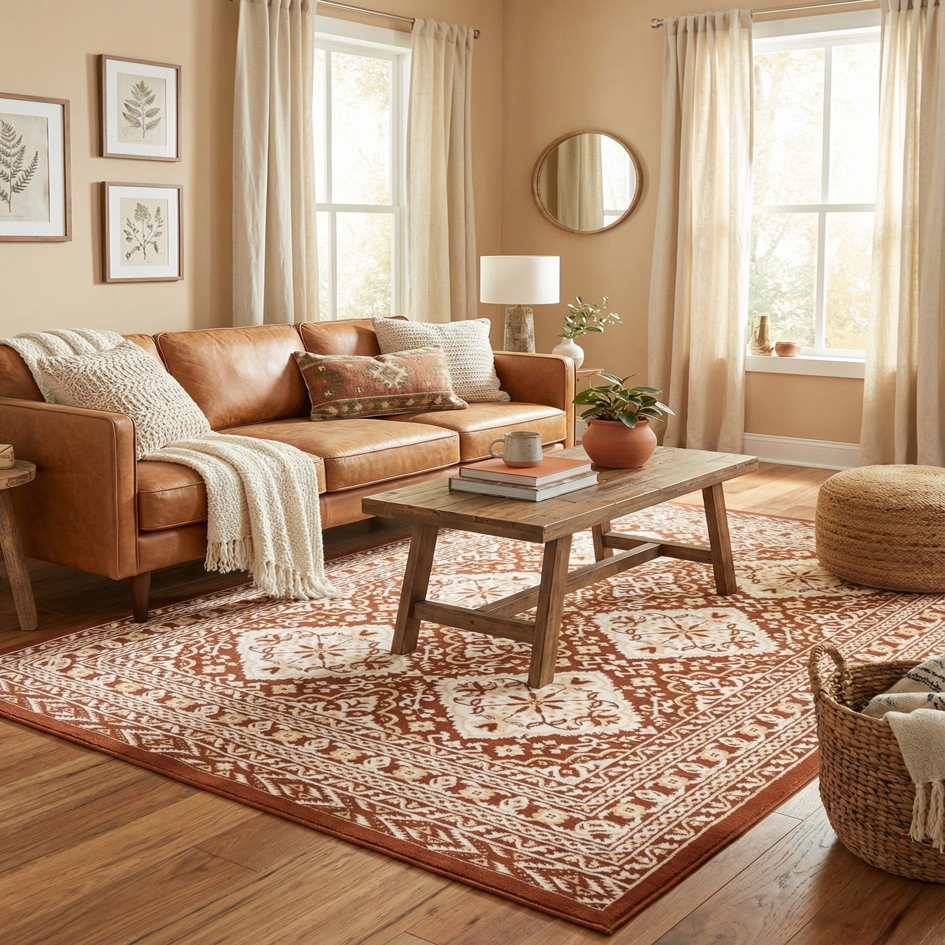 Primary color is Terracotta. Colors in this rug include: Terracotta, Ivory.