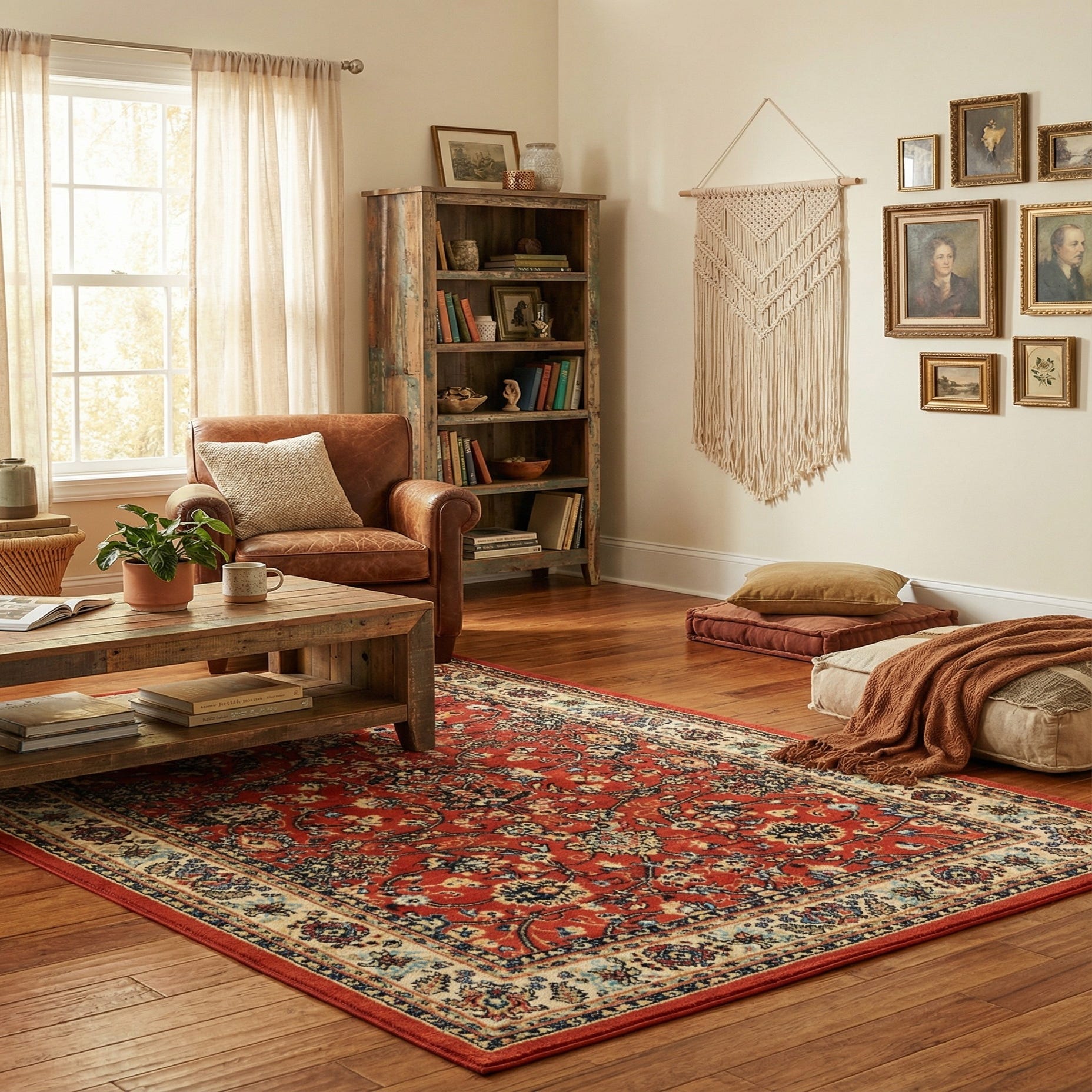Place this rug to ground a seating area beneath a sofa and coffee table or to bring color and pattern to a dining room. The terracotta base pairs naturally with warm woods and leather, and the blue and cream accents allow for cool-toned accessories like cushions or ceramics. Its construction makes it suitable for everyday spaces such as a family room or entry, where traditional styling and strong patterning are desired.