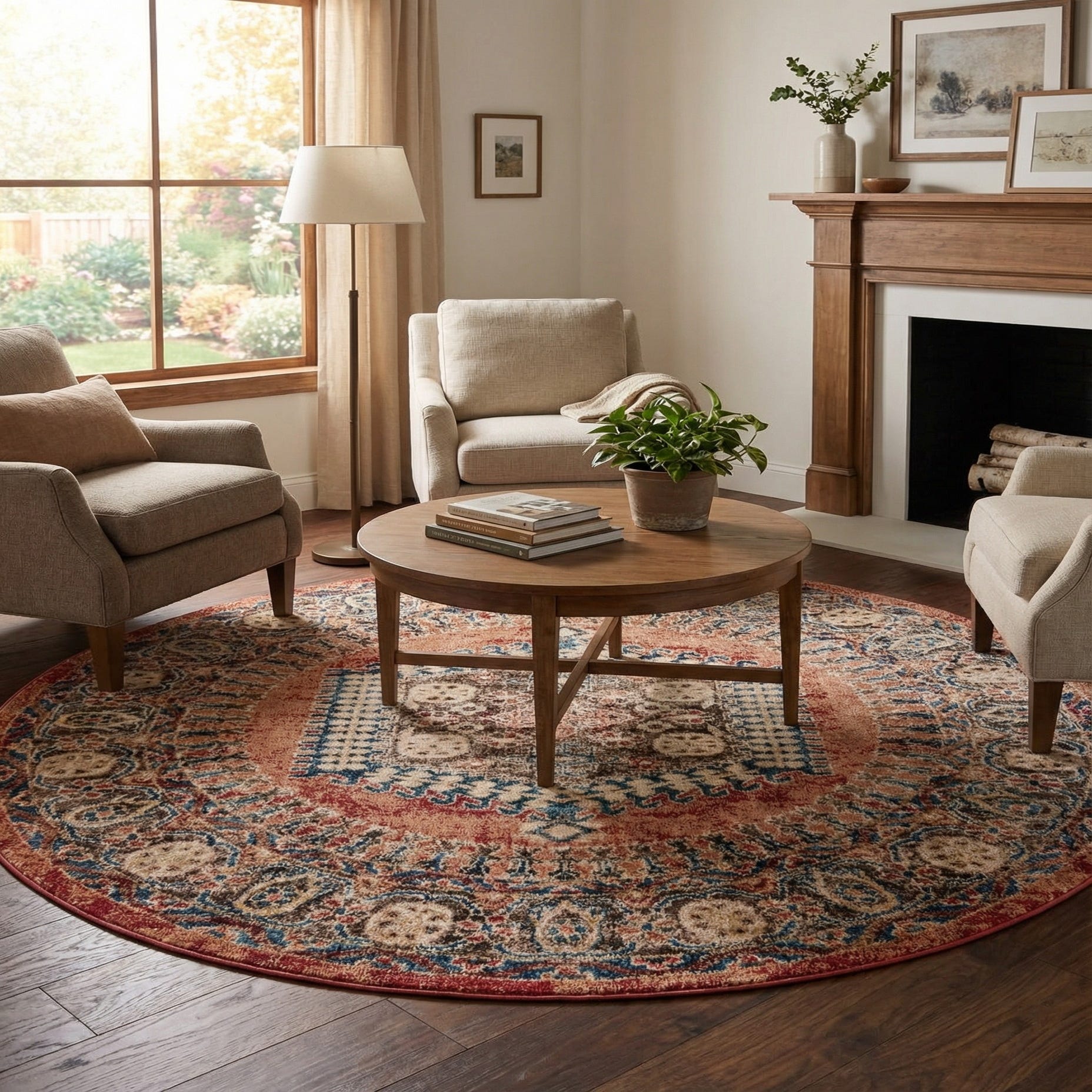 The round shape and classic motif work well beneath a circular dining table, centered in a seating area with a round coffee table, or as a focal mat in an entry or bedroom sitting nook. Pair it with warm wood furniture and leather accents to deepen the terracotta tones, or layer it with cool blue pillows and linens for a balanced, transitional palette. Its traditional styling also complements bohemian, farmhouse, and global-inspired interiors where mixed textures and warm color stories are key.