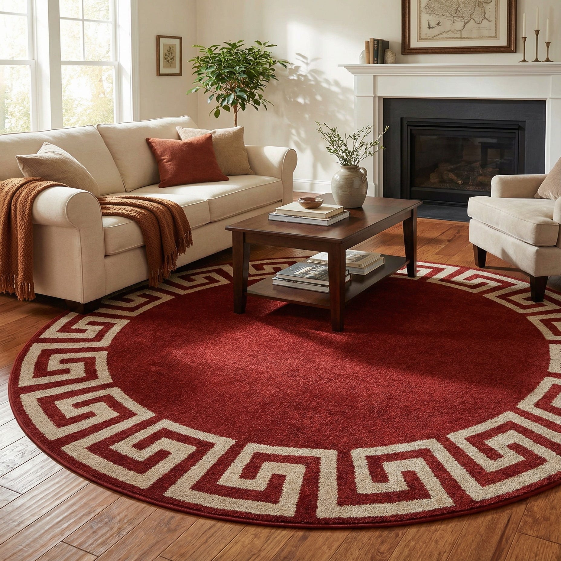 A rich terracotta field forms the backdrop for a bold beige Greek key border that frames the round silhouette. The pattern is straightforward and architectural — a clean, repeating meander that adds visual structure without overwhelming the space. Machine-made from 100% polypropylene, the rug has a low, dense pile that feels smooth and slightly springy underfoot, giving the surface a consistent texture that highlights the contrast between the solid center and the patterned edge.