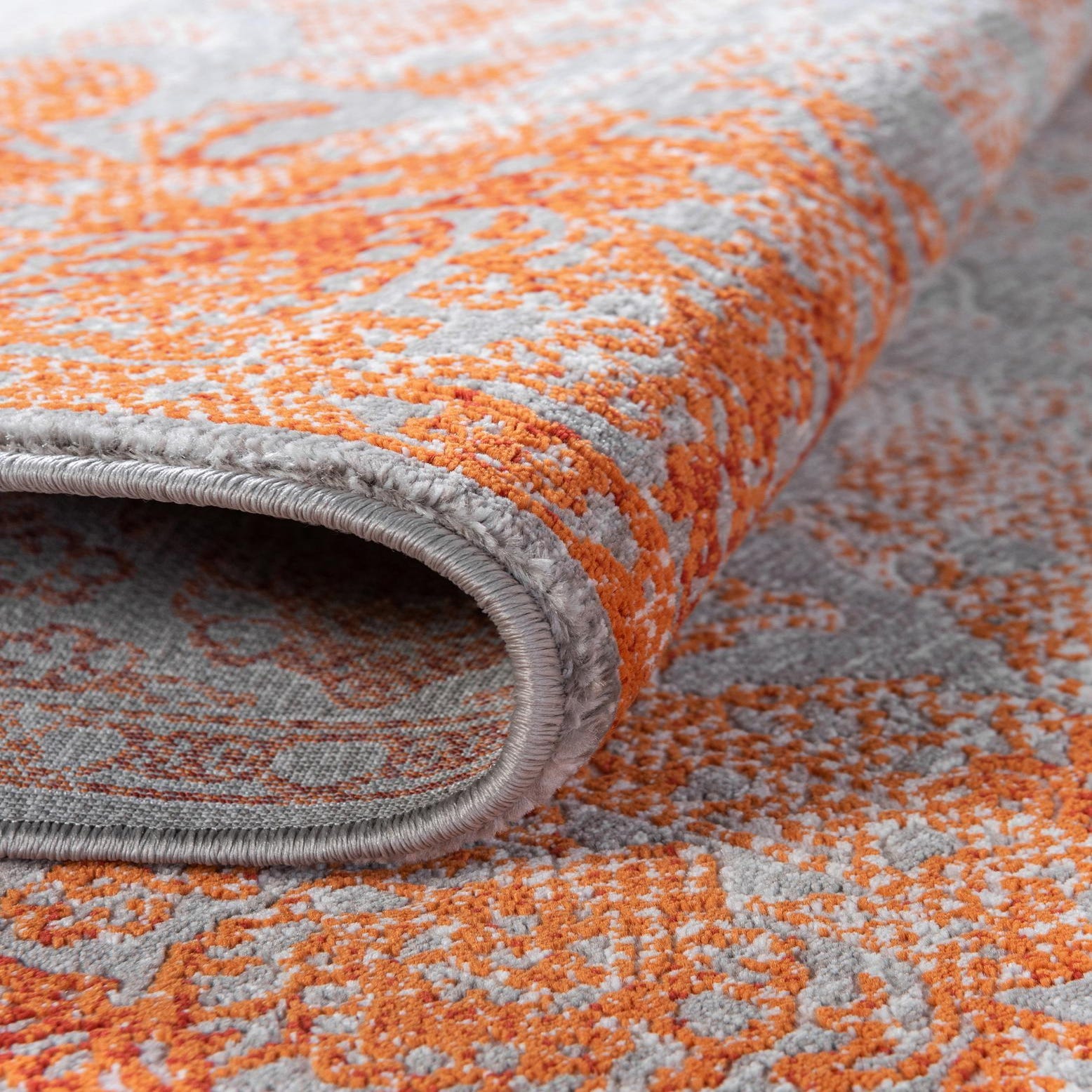 A warm terracotta ground sets the tone, with a distressed medallion and floral border worked in soft gray and ivory for a lived-in, layered look. The pattern blends traditional motifs with a faded finish, giving the design depth without heavy texture. Machine-made from 70% polypropylene and 30% polyester, the rug has a low-profile, tightly woven pile that feels smooth underfoot and offers a subtle sheen from the polyester highlights.