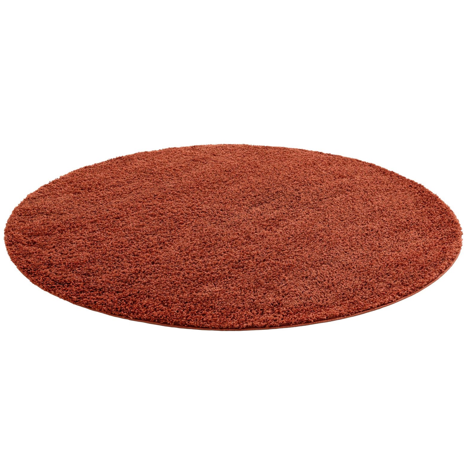 A warm terracotta round shag rug with a clean, solid field of color. The long, dense pile feels plush underfoot and invites you to pause — fibers have a slight sheen that gives the surface subtle shifts in tone as you move around it. With no distinct pattern, the rug offers a simple, tactile presence that anchors a space without competing with other design elements.