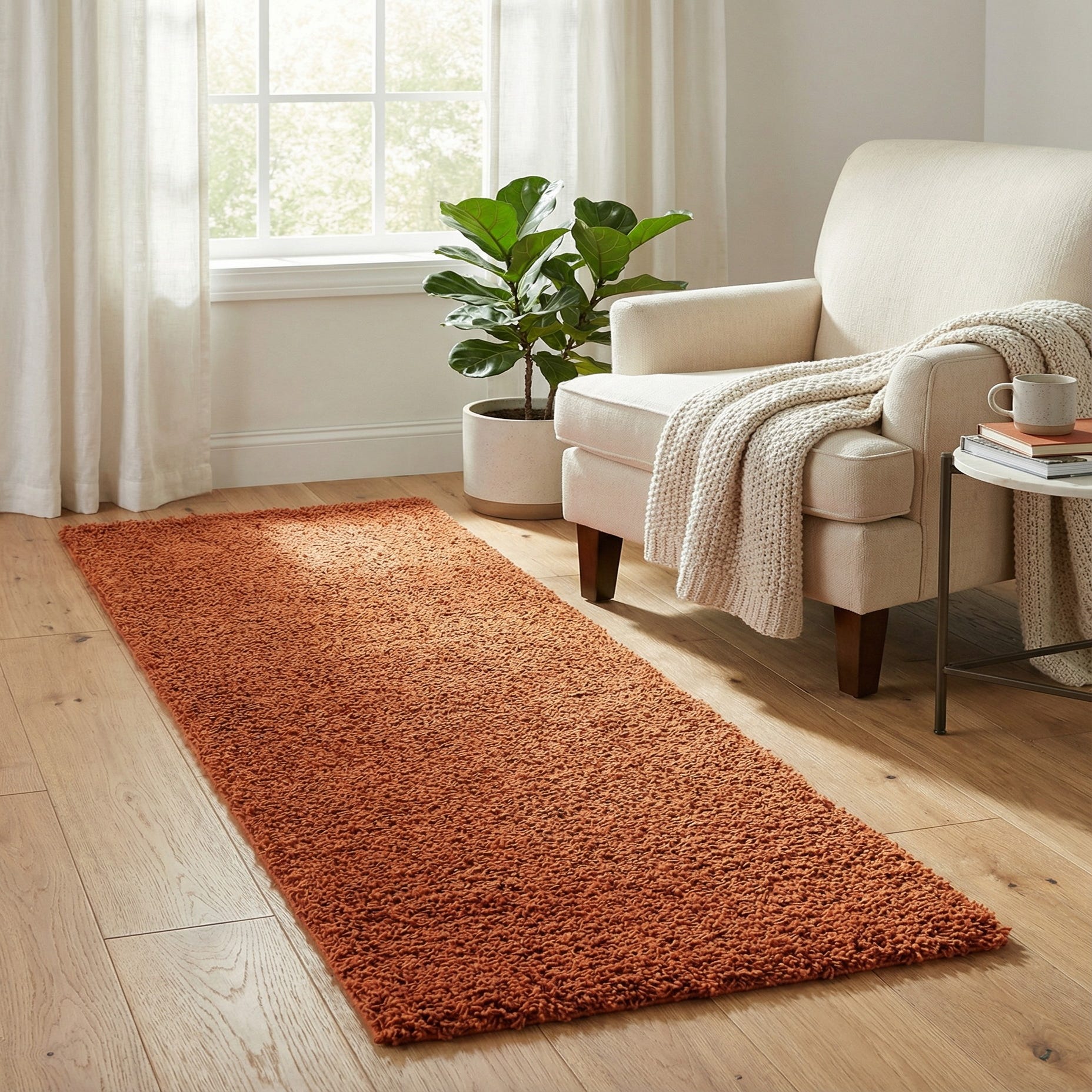A solid terracotta shag with a dense, high?pile texture that invites you to sink your toes into its warm, earthy color. The machine-made construction from 100% polypropylene delivers a plush, springy surface with a soft hand and subtle light reflection across the fibers, creating a consistent yet lively terracotta field. There are no patterns to distract from the rich hue—just a comforting, even pile that reads as tactile and cozy underfoot.