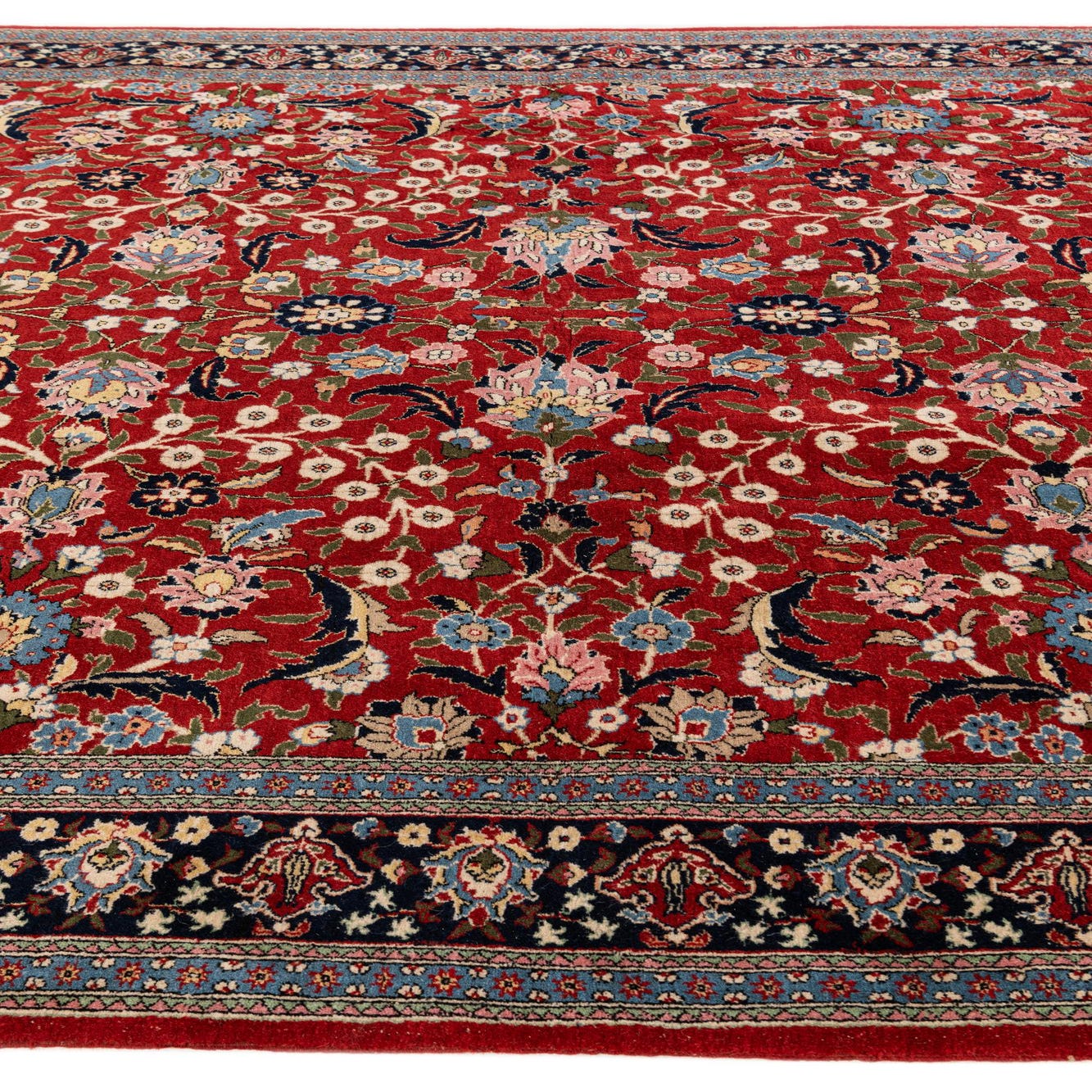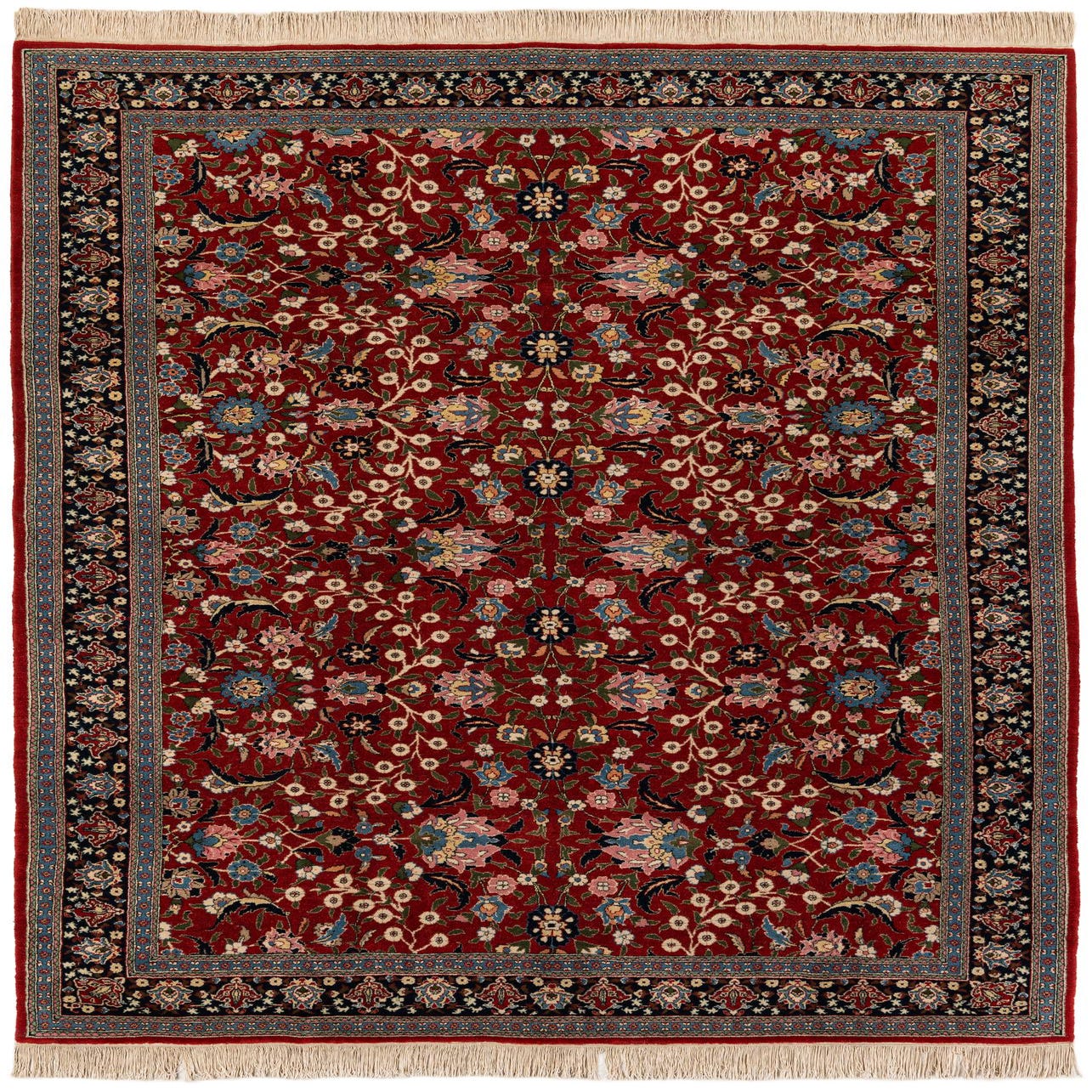 A 6x9 rectangular Oriental wool rug featuring a rich red field with intricate floral patterns and a dark border.