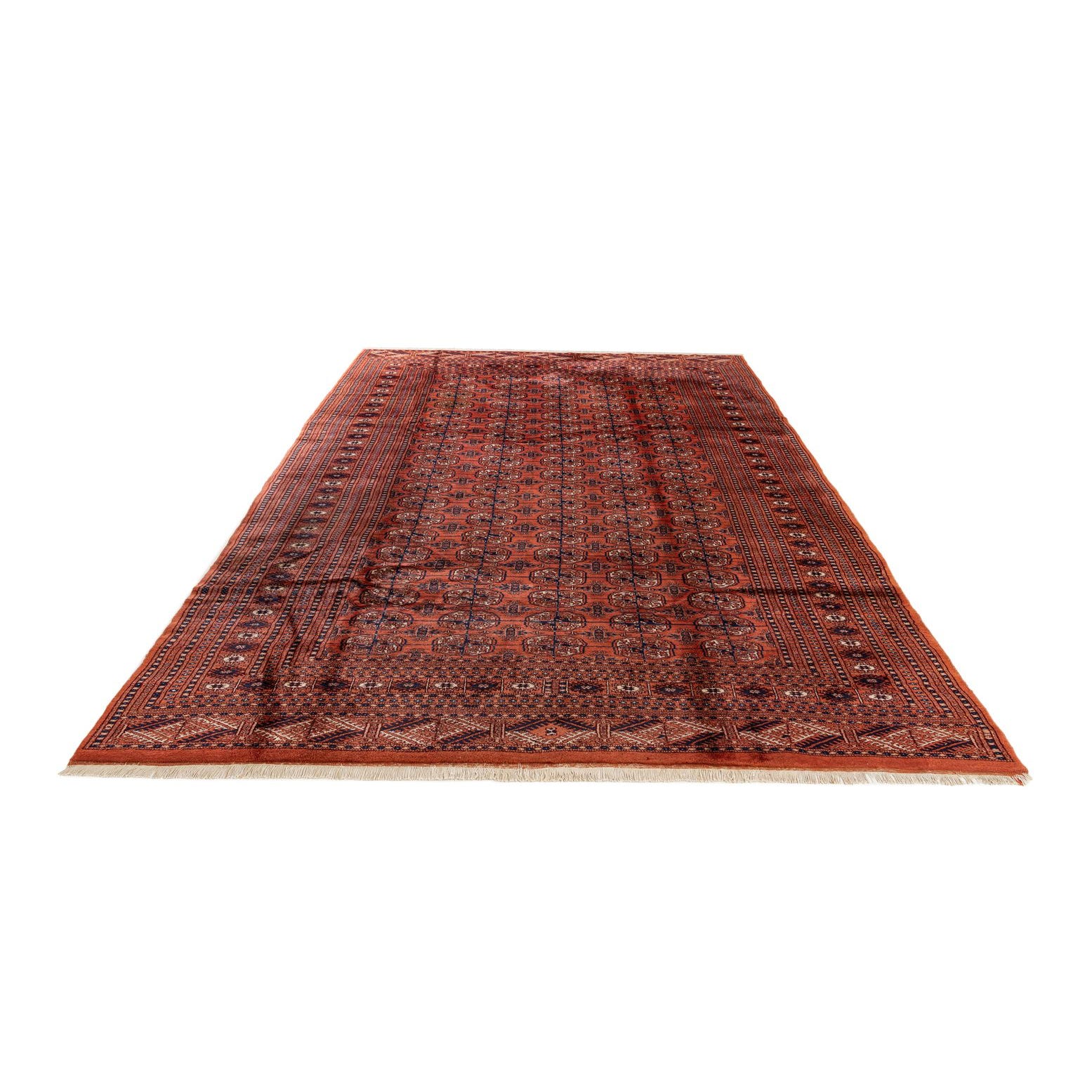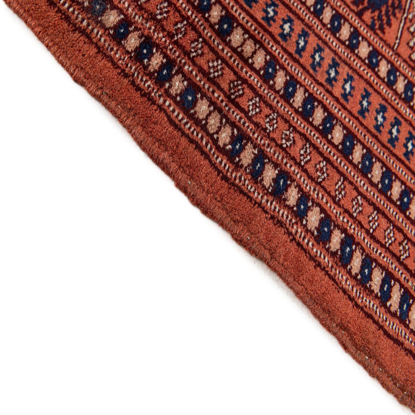 A 7x10 rectangular Bokhara rug featuring traditional tribal patterns in rich oranges, reds, and deep blue accents.