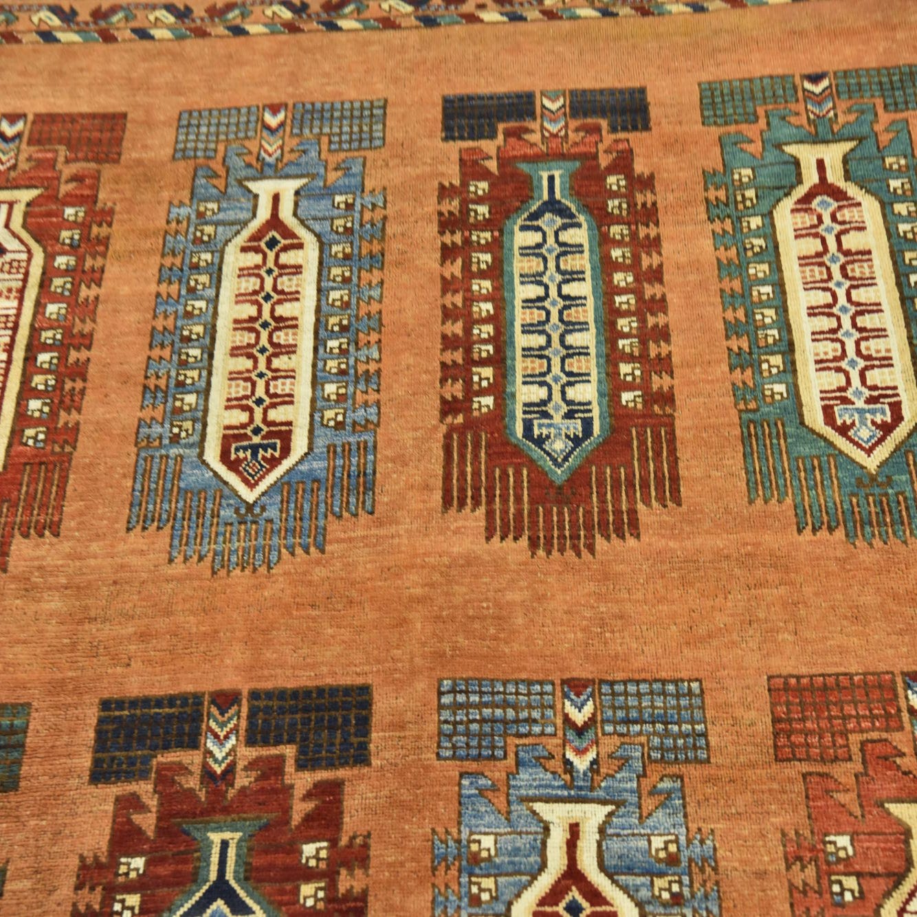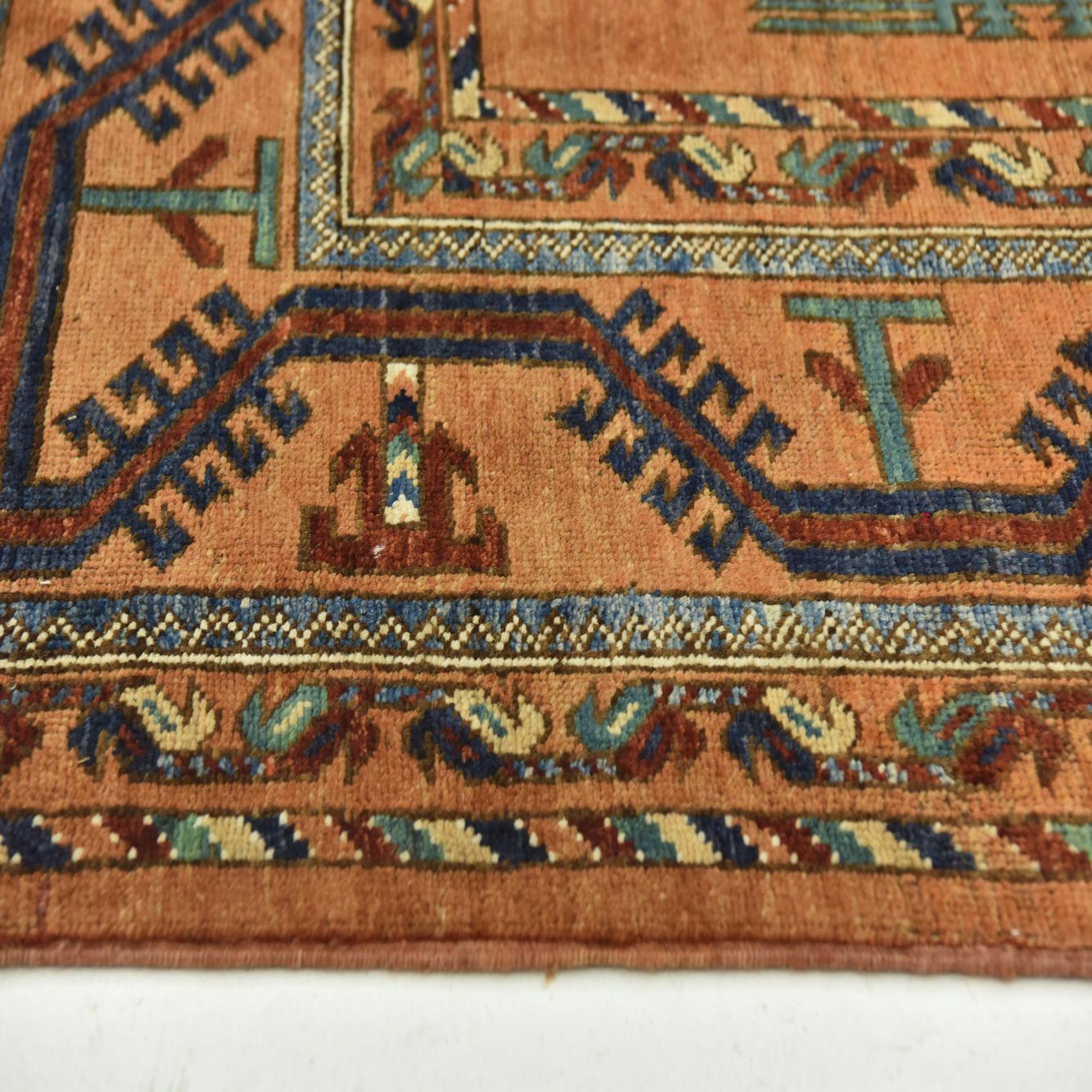 The rug's ground color is a warm terracotta, offering an inviting ambiance, while the pattern encompasses a harmonious blend of black, blue, green, cream, navy blue, orange, and rust-red hues. The geometric figures and motifs grace the surface in a deliberate sequence, creating a visual narrative that is both symmetrical and balanced.