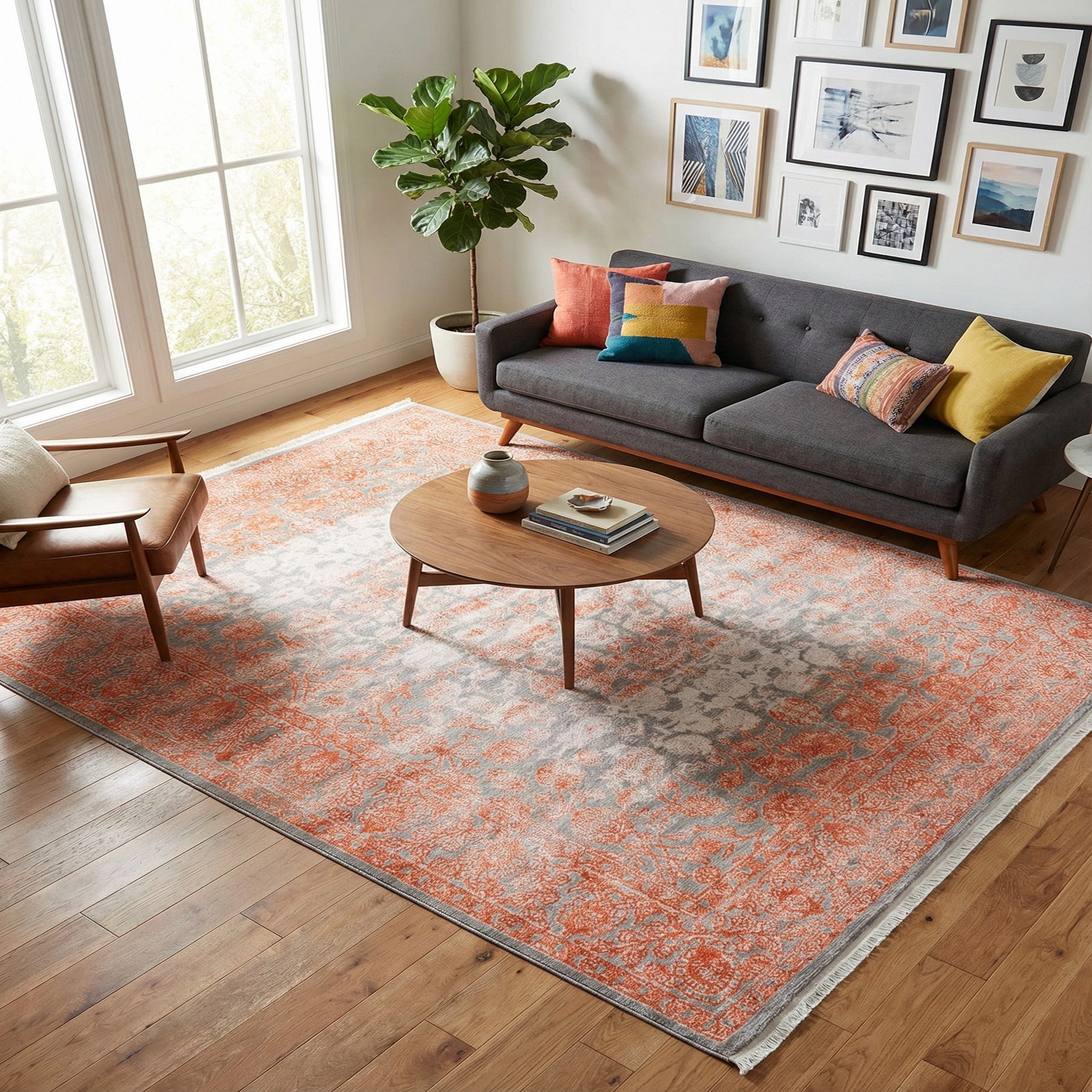 A classic floral medallion and ornate border are reinterpreted here with a softly distressed finish that balances tradition and modern living. The background is a warm terracotta that carries through the detailed border, while gray and ivory motifs float across the field in a faded, ombré effect. The pattern has a hand-worn look with crisp floral outlines and subtle shading that gives depth without heavy contrast.