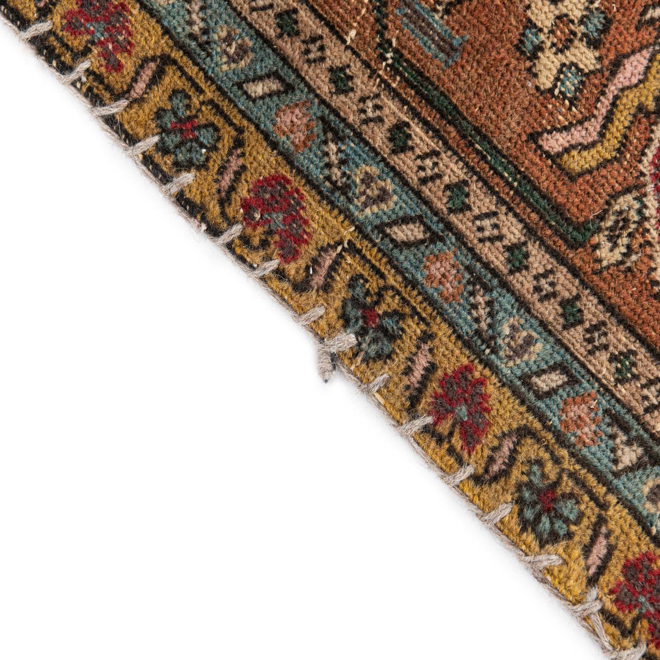 Primary color is Terracotta. Colors in this rug include: Terracotta, Brown, Ivory, Navy Blue, Gold, Red, Black.