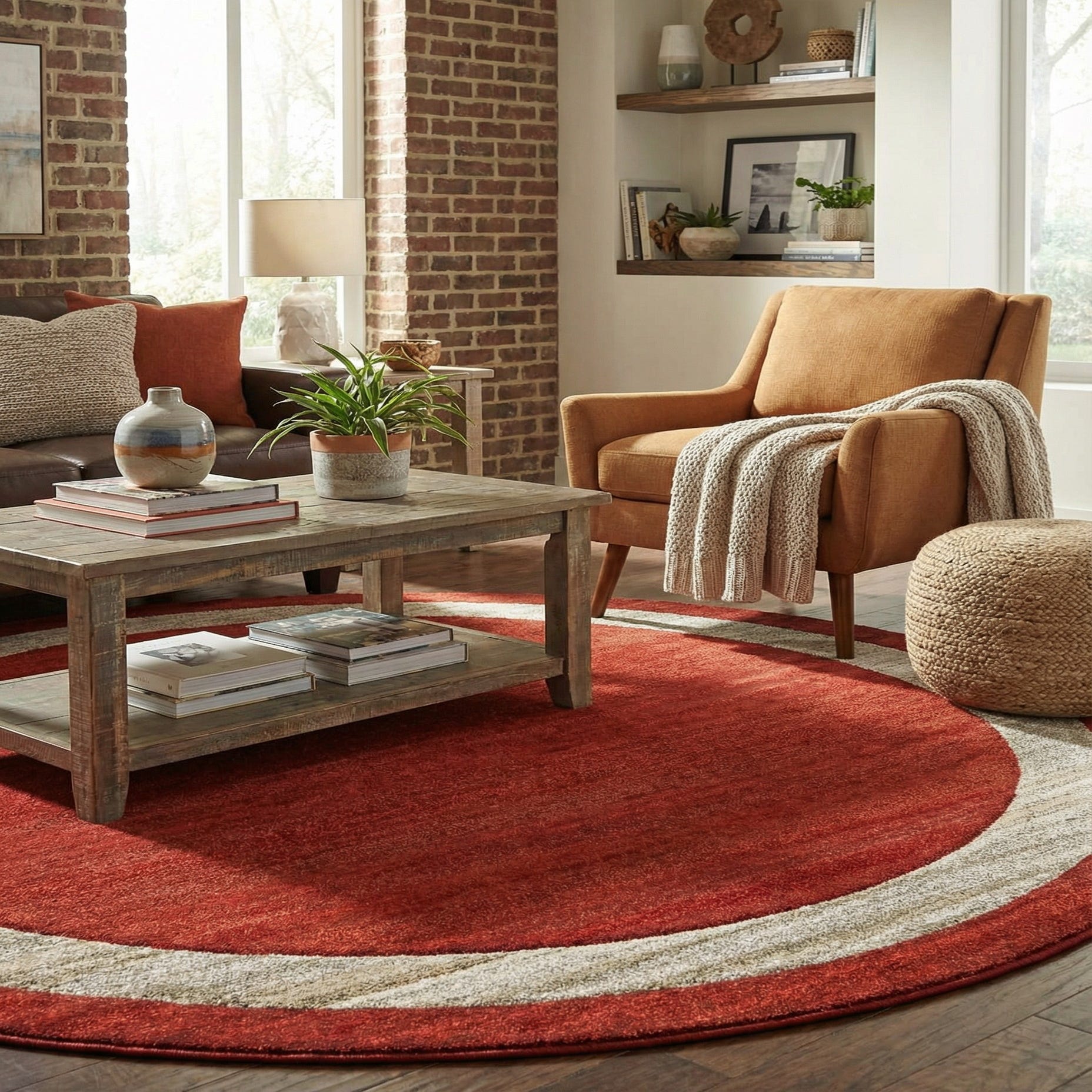 This round area rug's inviting palette and timeless design lend itself to a wide range of interior settings. Its terracotta base conveys warmth and would complement interiors with earthy tones or act as a striking focal point against more neutral decors. The incorporation of polypropylene not only provides a soft texture underfoot but also offers stain-resistant qualities, making this rug a functional choice for high-traffic areas, dining rooms, or living spaces.