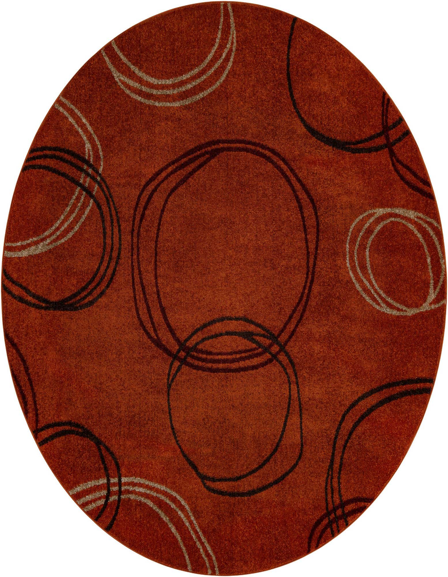 The Equinox Collection presents a harmonious 8 Ft Round rug, machine woven of 100% polypropylene, bringing durability into your living space. Showcasing a terracotta background, the piece is complemented by accent hues of beige, brown, and burgundy. The playful, abstract pattern with concentric circles adds a contemporary touch, while the terracotta provides a warm, inviting base color that anchors a room with ease.