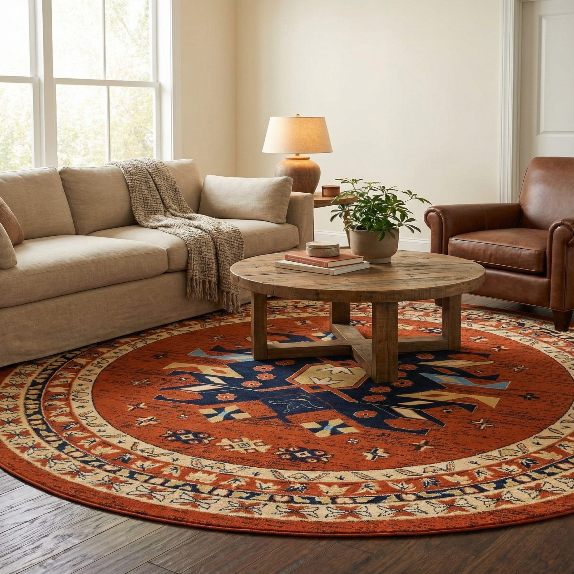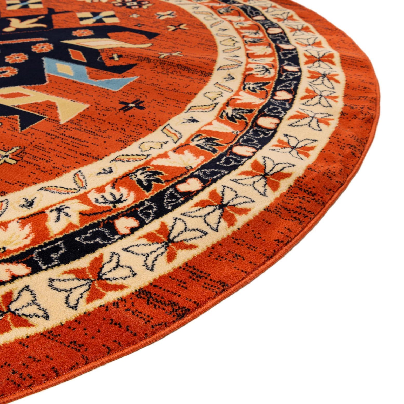 A traditional, geometric medallion pattern anchors this round rug, with a bold navy centerpiece set against a warm terracotta field. Cream bands and light-blue accents trace the layered border and small floral motifs, adding contrast and visual rhythm without overwhelming the design. The pattern reads as classic and structured, with crisp lines and repeated shapes that create a balanced, grounded look.