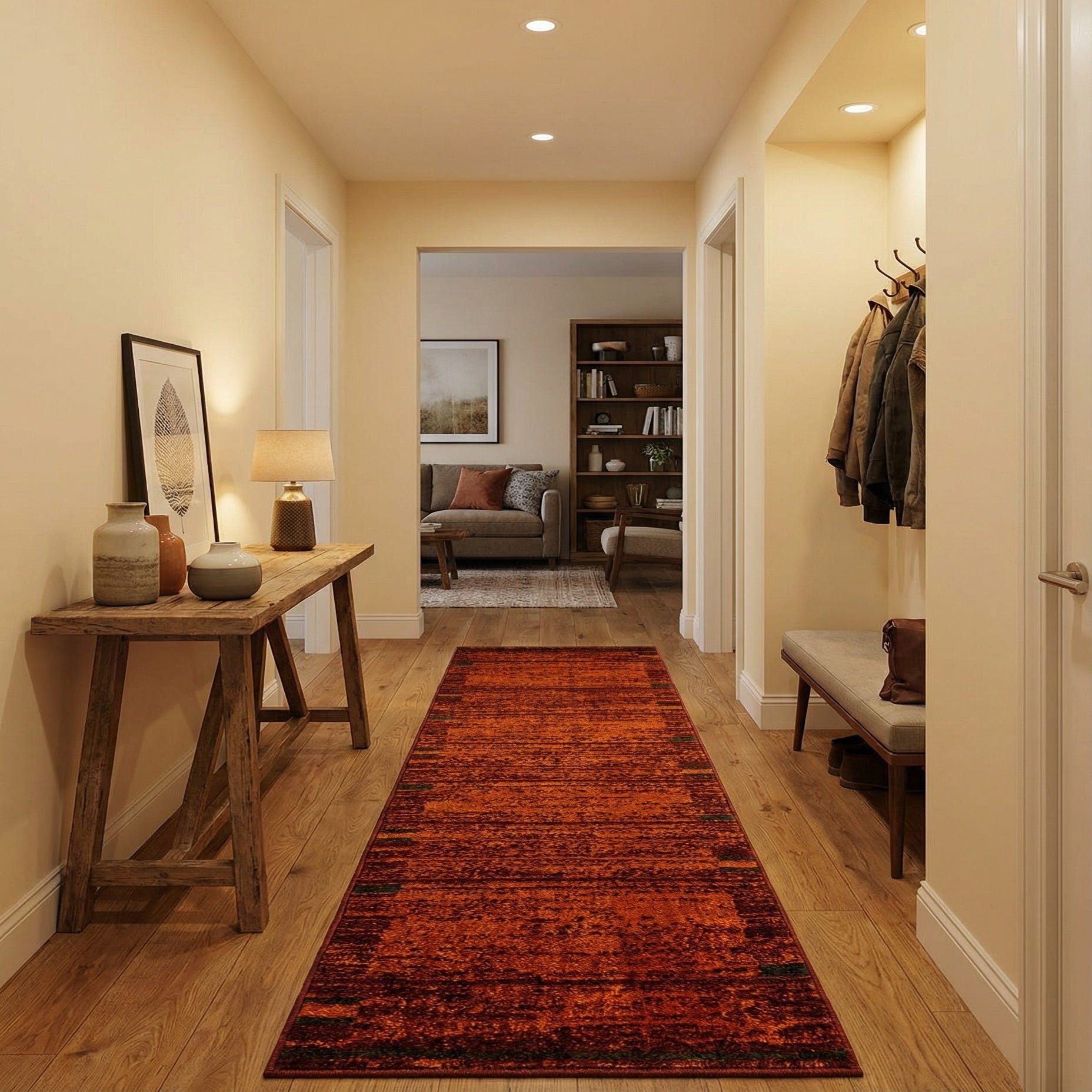 Place this runner in a hallway or entry to introduce rich, autumnal color and visual warmth, or layer it along a narrow kitchen or stair landing to anchor warm wood floors and leather furnishings. Its color palette and simple, linear pattern suit mid-century modern, rustic, southwestern, or contemporary transitional interiors — pair it with brass or matte black metal accents and natural textures to balance the deep terracotta and burgundy tones.