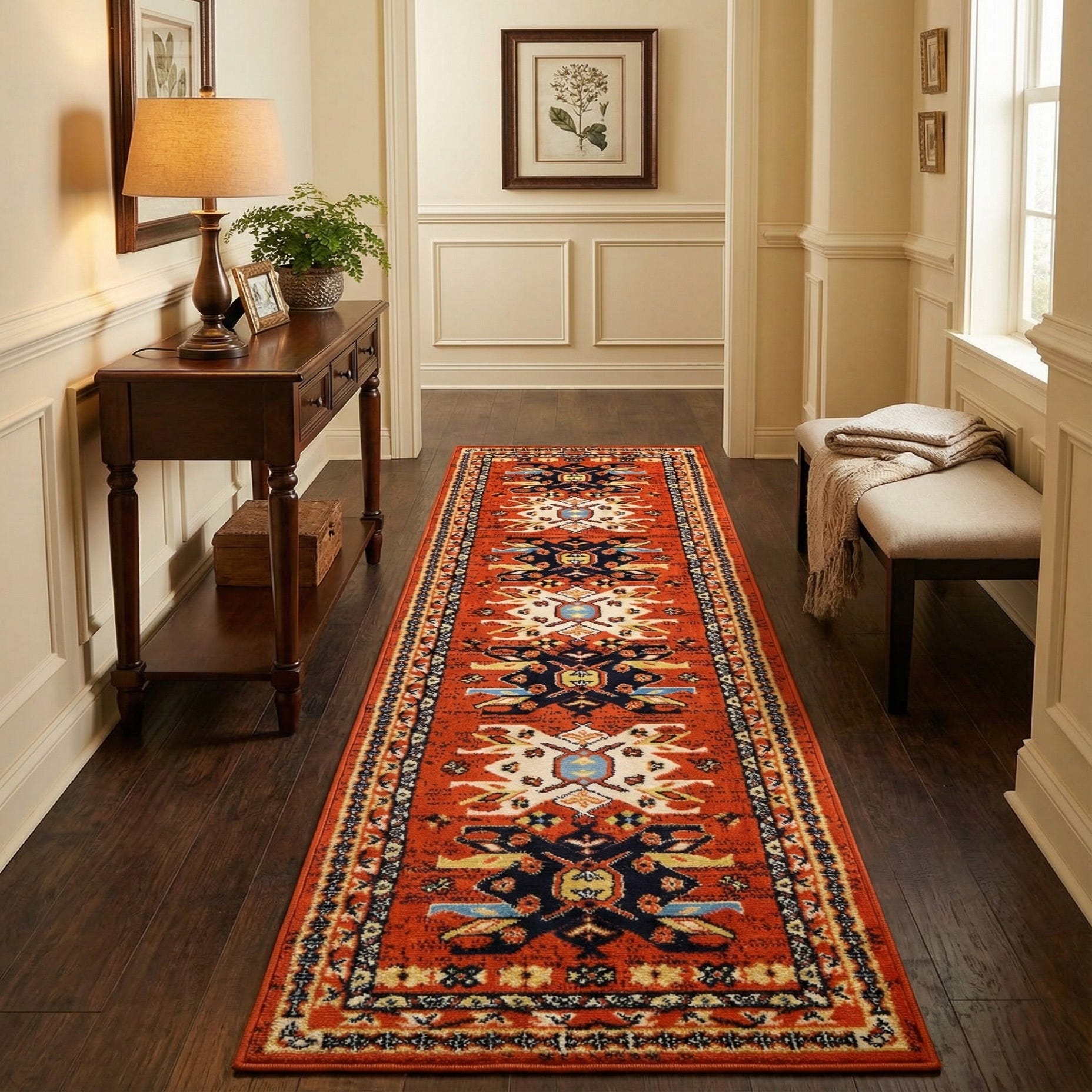 An 8 ft runner rug featuring a traditional Southwestern tribal medallion pattern in oranges, reds, navy, cream, and gold.
