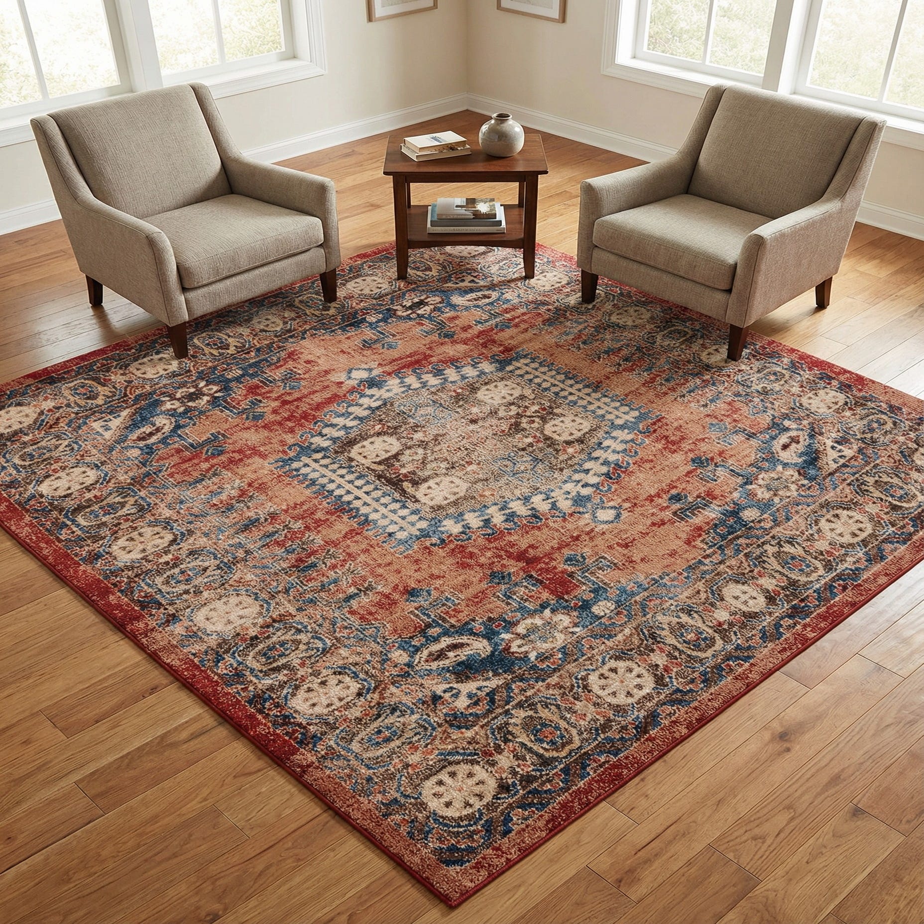 Machine made from 100% polypropylene, the rug has a low, dense pile with a smooth, slightly lustrous hand and a flat, stable edge profile. Its vintage character and balanced color palette pair well with warm wood furniture and leather seating, and it works equally well layered in a relaxed bohemian living room, anchored beneath a dining table in a transitional space, or placed in an entry or bedroom to introduce color and pattern without overpowering the room.
