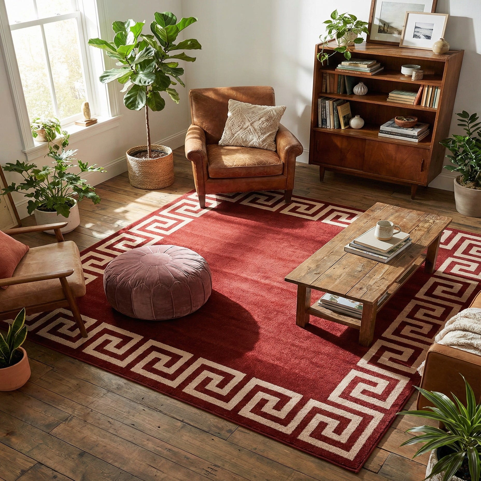 A classic Greek key border in beige frames a warm terracotta field, creating a clean, architectural look that reads both modern and timeless. Machine-made from 100% polypropylene, the rug has a low, dense pile with a soft hand that feels comfortable underfoot while maintaining a smooth, tailored surface. The contrast between the terracotta background and the crisp beige motif brings depth and definition without overwhelming a room.