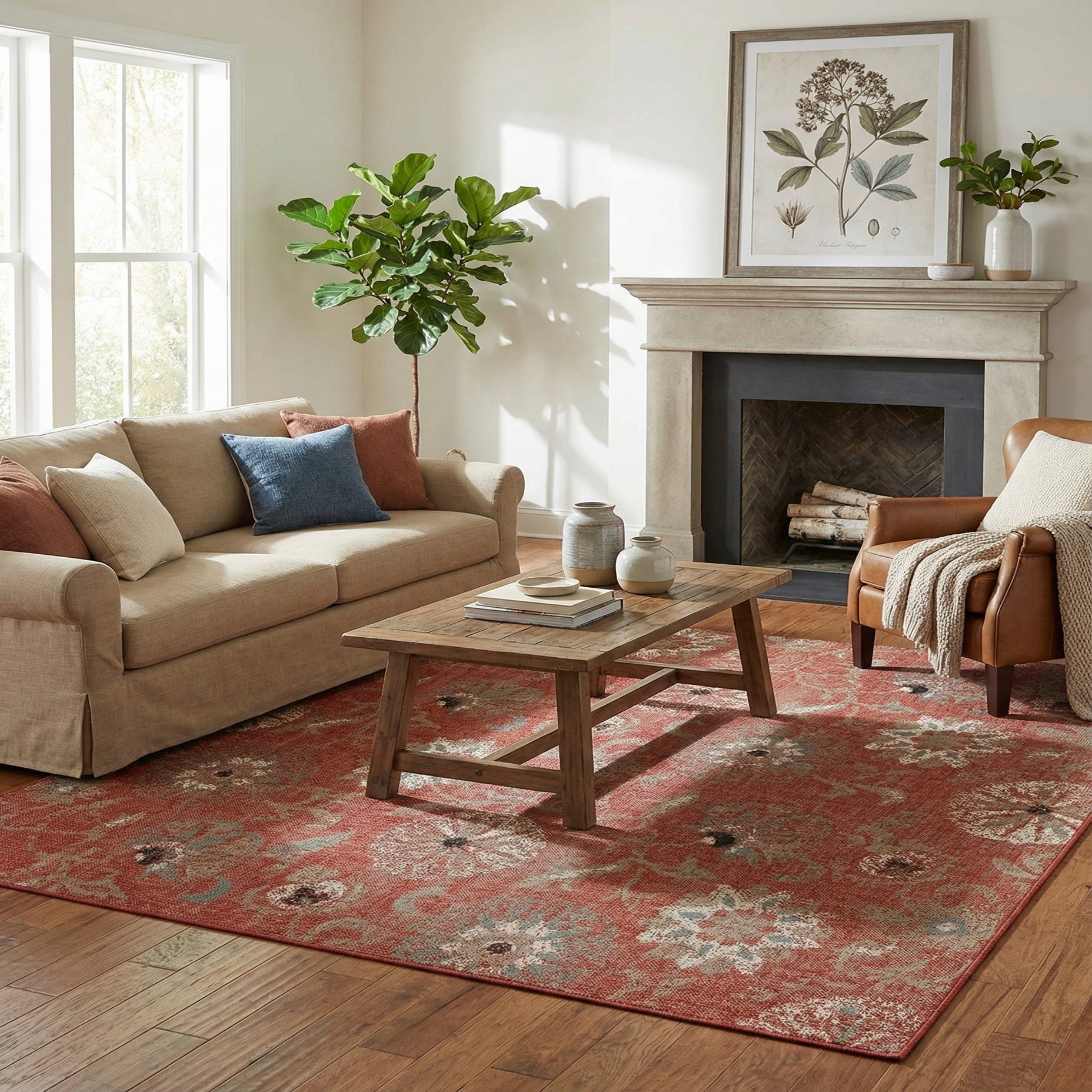 Works beautifully with natural materials and warm wood tones — think rattan seating on a covered patio, a teak dining set on a screened porch, or layered with sisal and linen in a sunroom. The terracotta base pairs well with deep blues, warm neutrals and black accents, making it equally suitable for Mediterranean-leaning interiors, southwestern palettes, or a casual coastal scheme that benefits from a pop of earthy color.