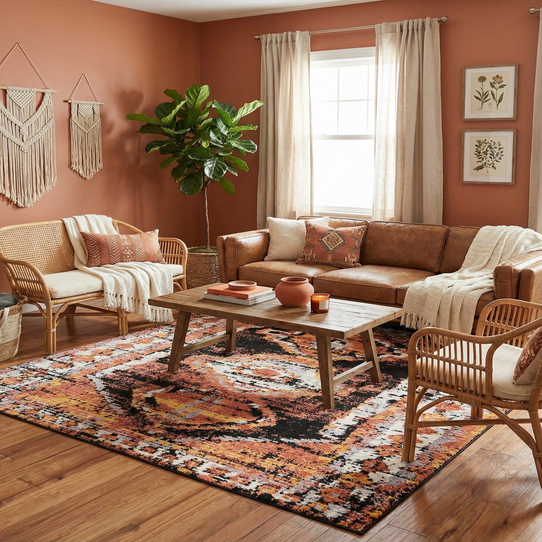 Machine made from 100% polyester, the pile has a soft, slightly lustrous hand and a low-to-medium profile that feels comfortable underfoot while keeping a smooth, even surface. The square shape works well to define a seating area or center a conversation grouping; it pairs naturally with warm woods and leather, mid-century modern sofas, or layered bohemian textiles. The palette also complements industrial interiors when combined with black metal accents, or a modern farmhouse scheme with neutral upholstered pieces and natural fibers.
