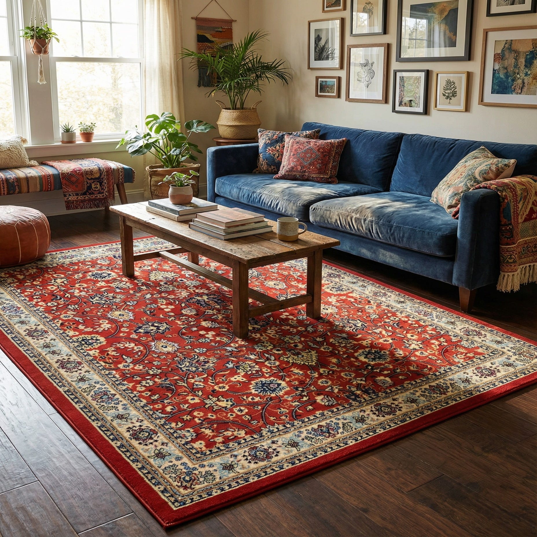 Primary color is Terracotta. Colors in this rug include: Terracotta, Cream, Light Blue, Navy Blue, Orange, Rust Red.
