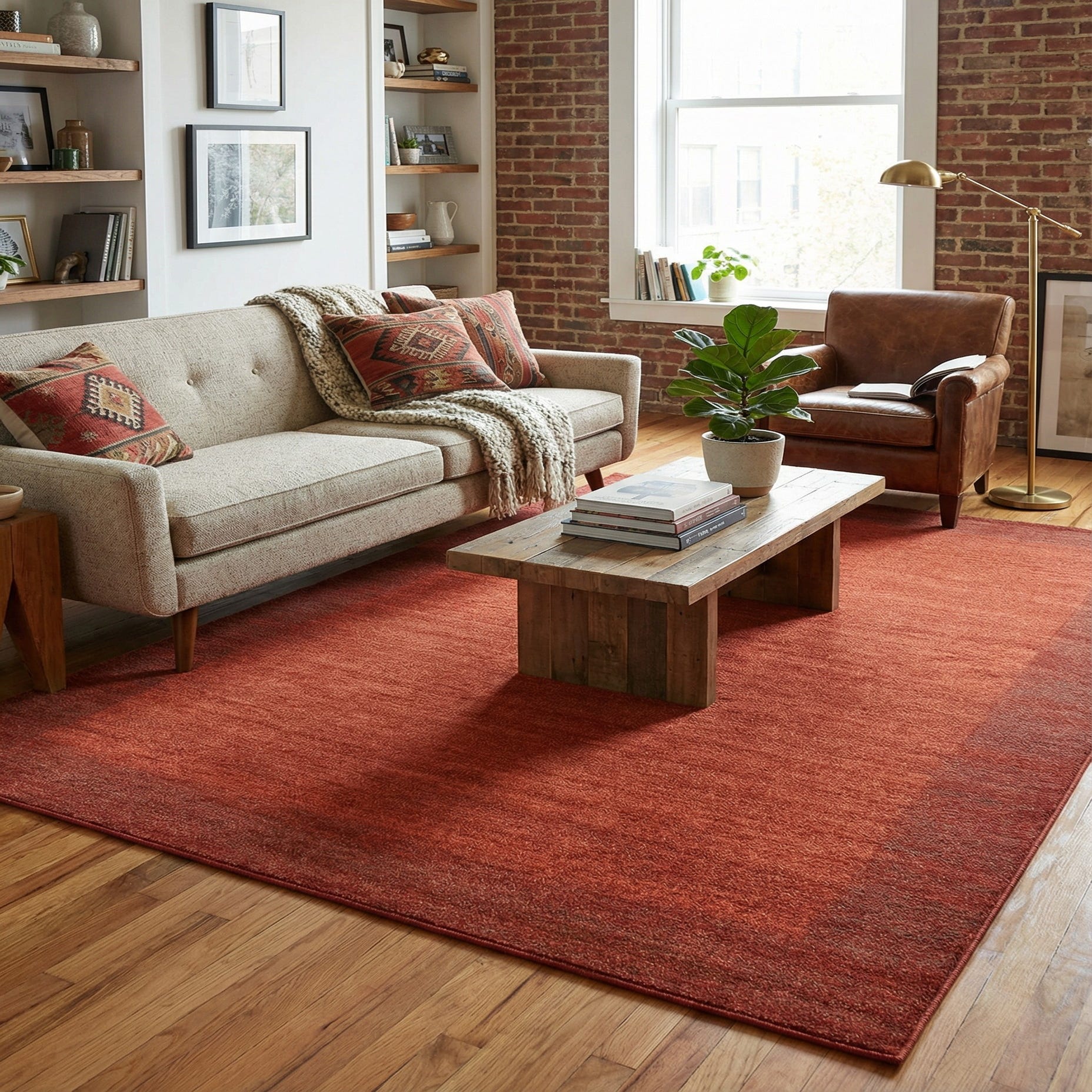 This rug works well anchoring a living room seating area beneath a sofa and coffee table or grounding a dining table set with warm wood chairs. Pair it with cream or beige upholstery to balance the rich color, or combine it with walnut or leather furniture and brass accents for a mid-century modern or rustic contemporary scheme. It also layers nicely with textured throws and natural greenery to create a warm, inviting atmosphere.
