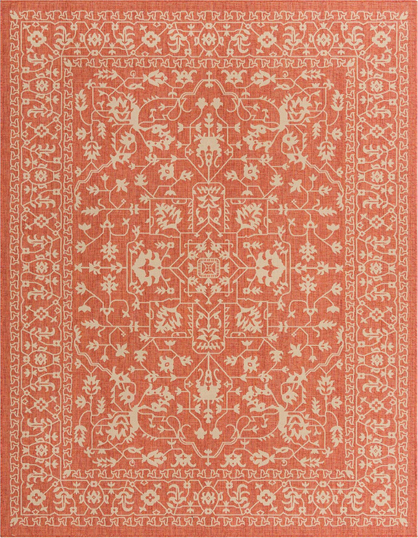 This rug works well in covered outdoor spaces, sunrooms, or any living area where a pop of warm, earthy color is wanted. Pair it with natural wood furniture, rattan or wicker seating, and neutral linens for a relaxed, layered look, or use it to anchor a dining area with black metal or matte brass accents for a balanced, contemporary-national mix. Its durable construction and classic pattern make it a versatile choice for patios, kitchens, and casual living rooms that favor welcoming, grounded color.
