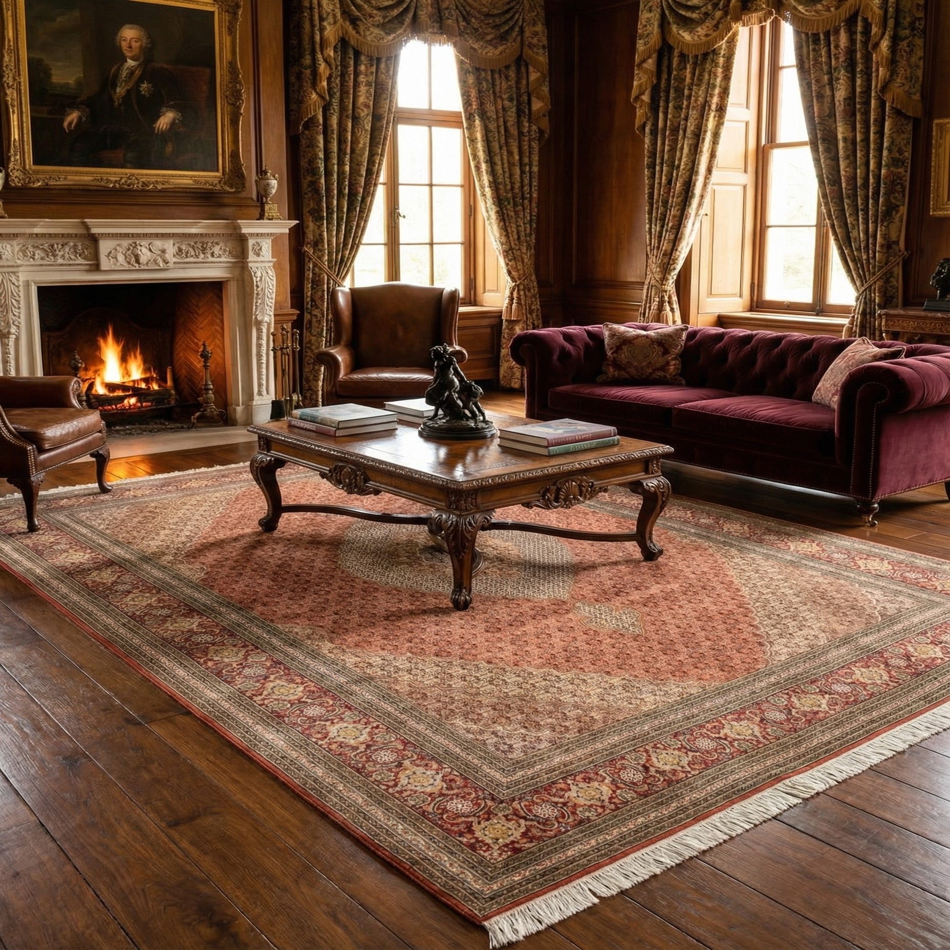 A classic Persian medallion layout sits at the center of this hand-knotted wool and silk rug, its terracotta field framing an intricate central medallion and repeating floral-lattice motifs. Layers of narrow guard borders surround a wider outer border dotted with palmettes and vine scrolls in red, gold, navy blue and olive, while beige and black outline the finer details. Running your hand across the surface, the wool pile feels dense and springy and silk highlights give selected motifs a subtle, cool sheen that lifts the pattern without overpowering the warm terracotta ground.