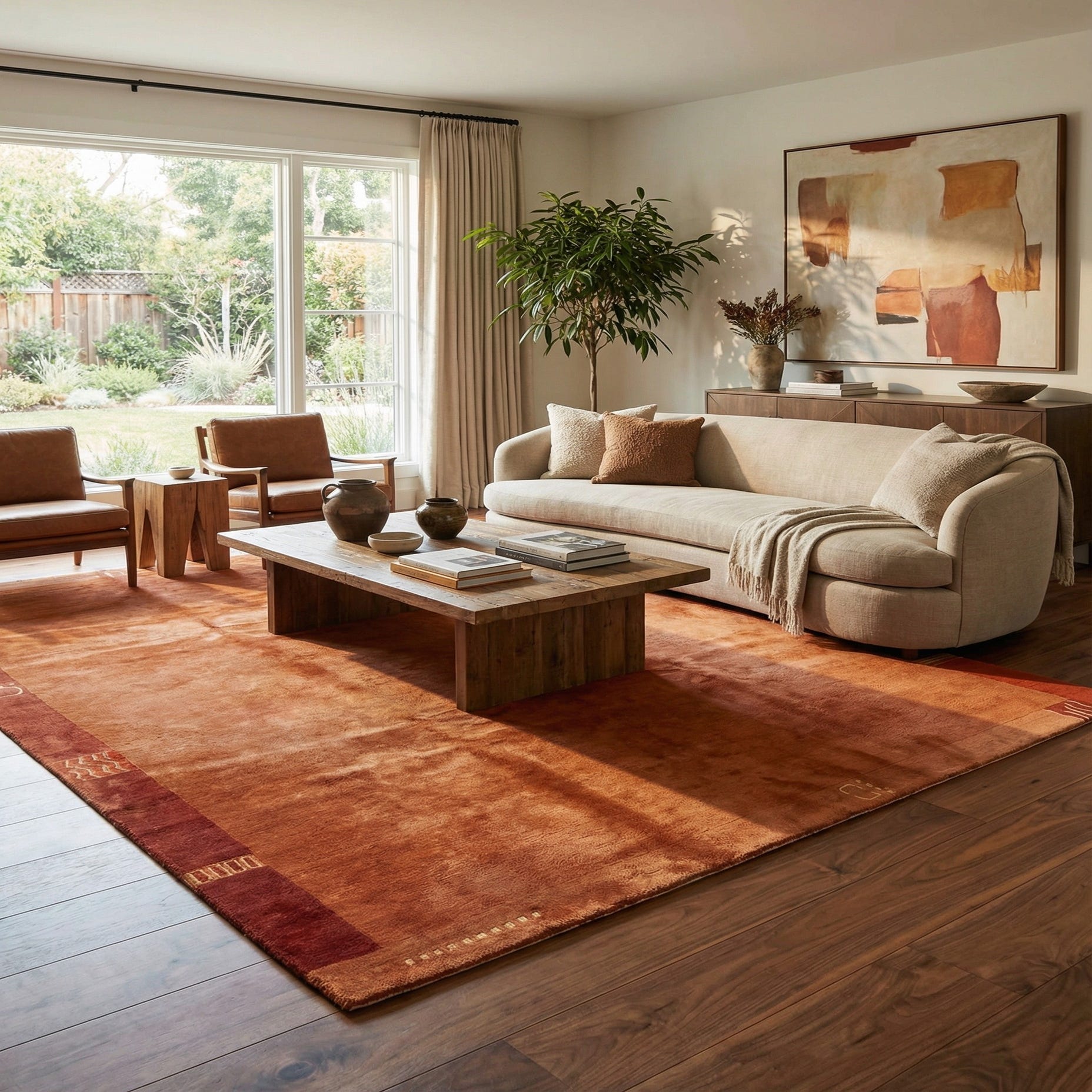 This rug suits a range of interiors: place it beneath a mid-century modern seating group to warm walnut finishes and cream upholstery; anchor a contemporary dining table in a natural wood tone for an inviting, cohesive look; or pair it with layered textiles, plants, and mixed materials in a relaxed bohemian study. Its earthy palette and simple border make it easy to coordinate with both neutral schemes and richer accent colors like rust, deep brown, or muted gold.