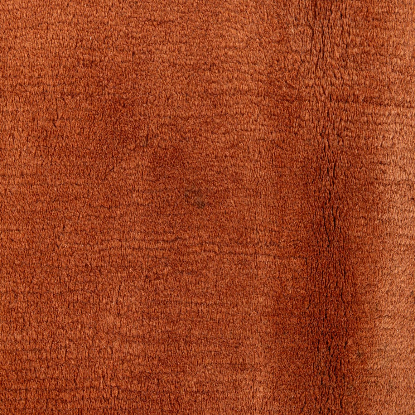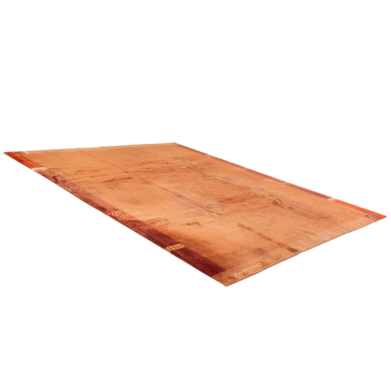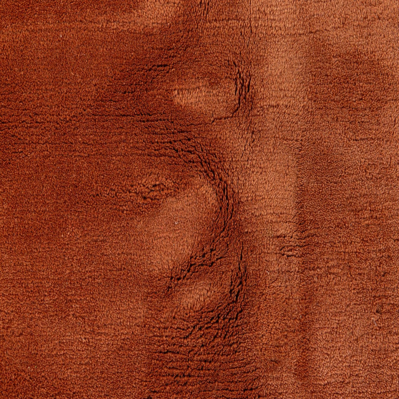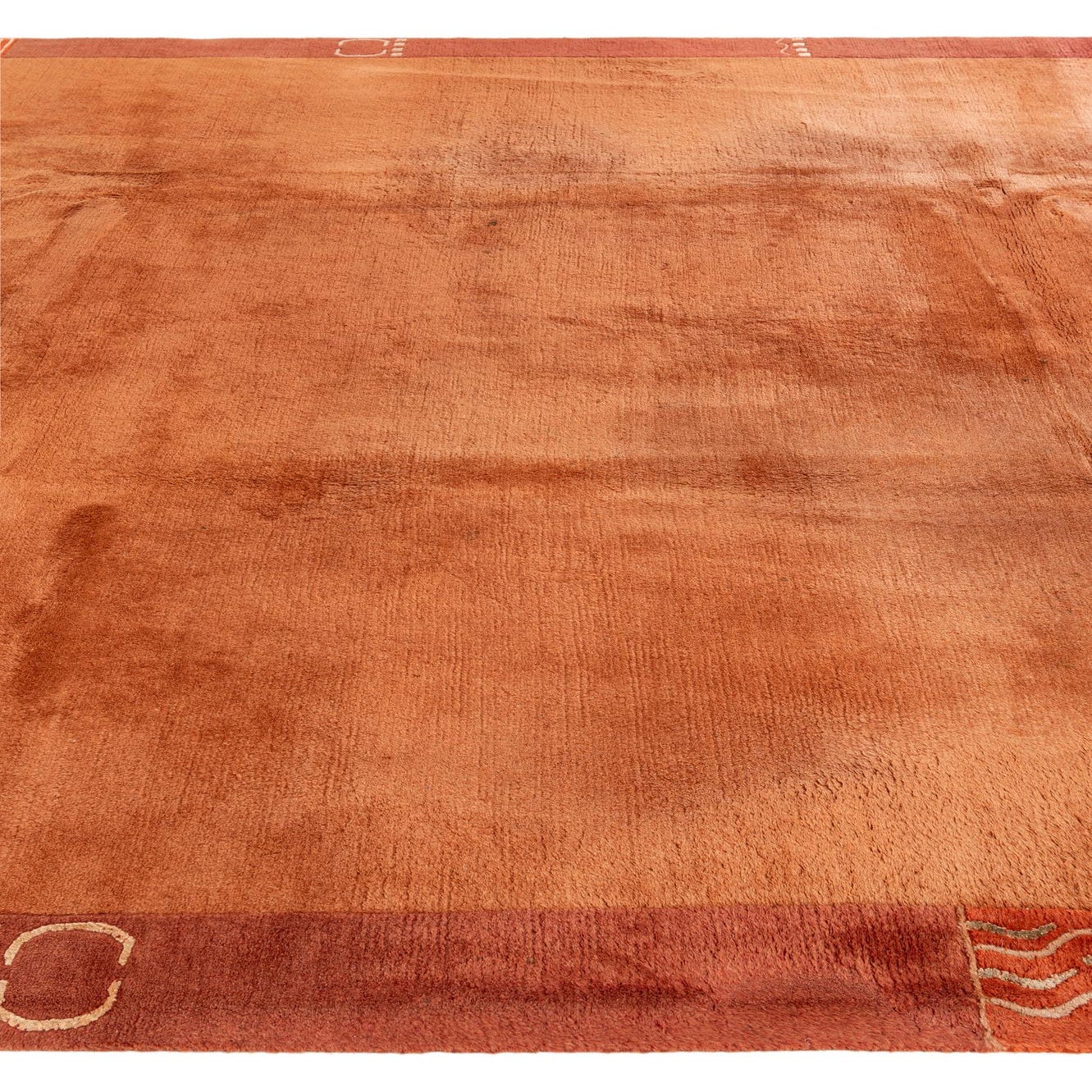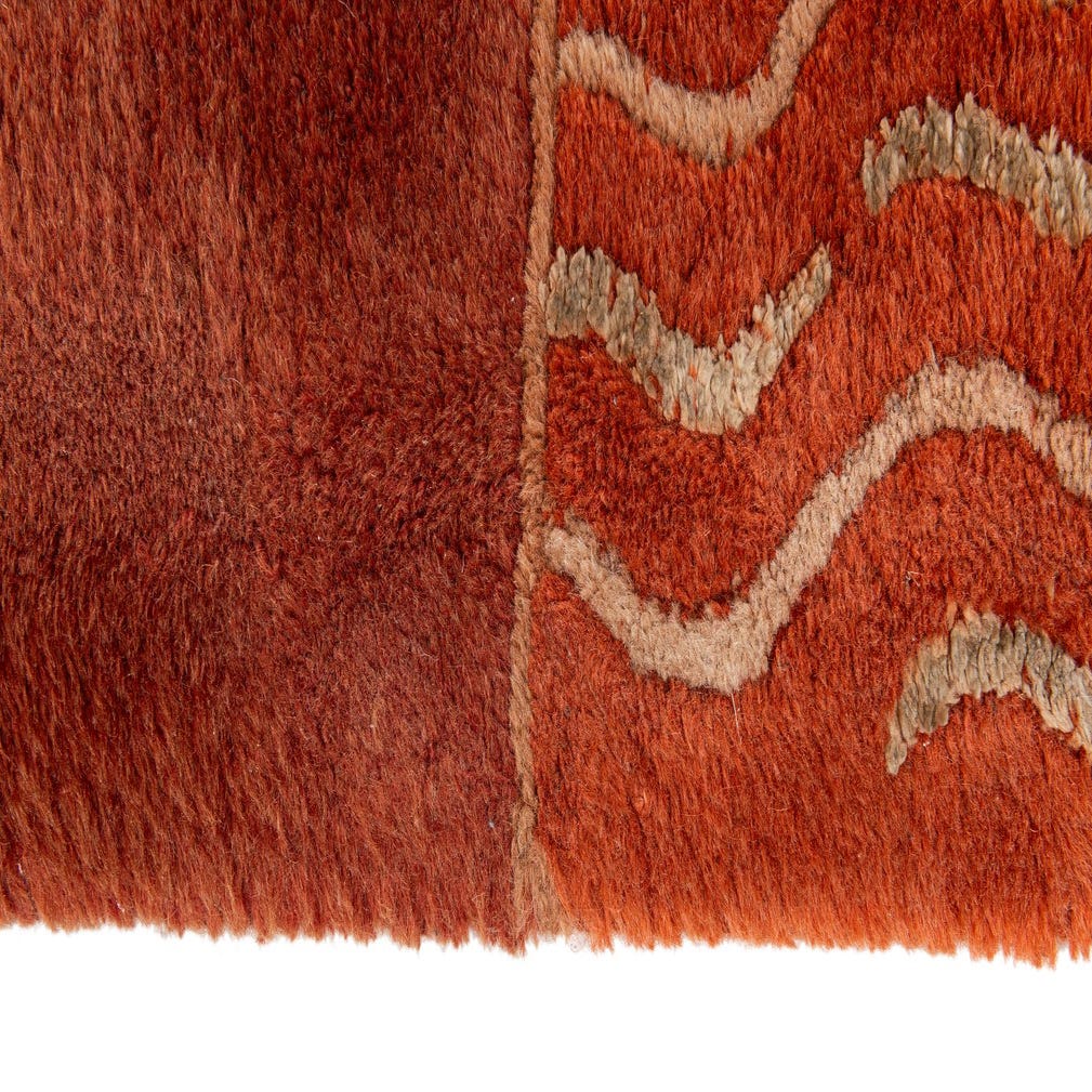 A hand-knotted rug woven from 80% wool and 20% silk, this piece presents a warm terracotta field with subtle tonal variation across a soft, low pile. A narrow border in deeper brown and orange frames the central field, punctuated by small, reserved geometric motifs in a light neutral that add rhythm without visual clutter. The wool provides a dense, velvety feel underfoot while the silk threads catch light for a gentle, polished sheen that highlights the pile’s surface texture.