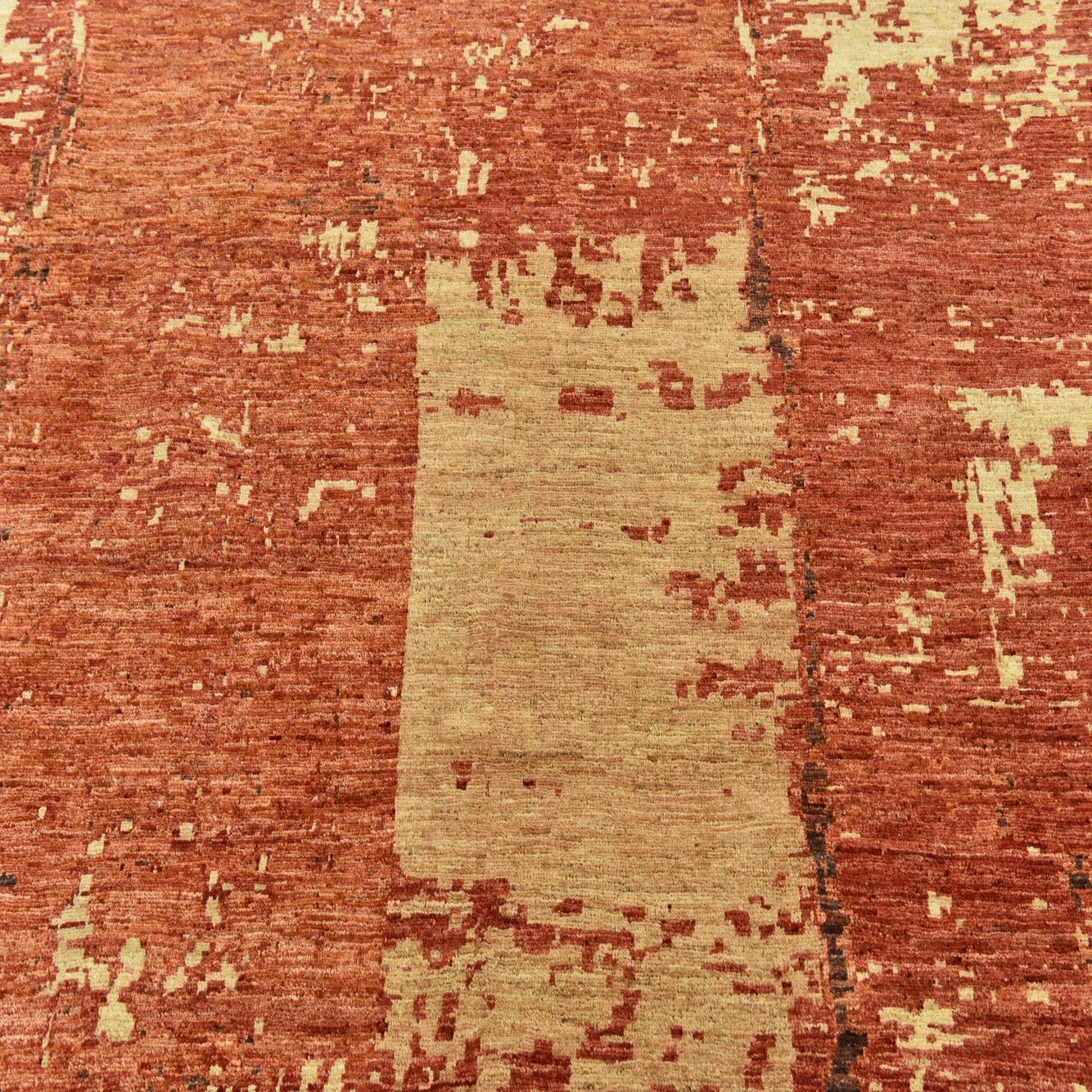 A 9x11 rectangular modern abstract rug featuring a distressed pattern in shades of orange, red, and cream.