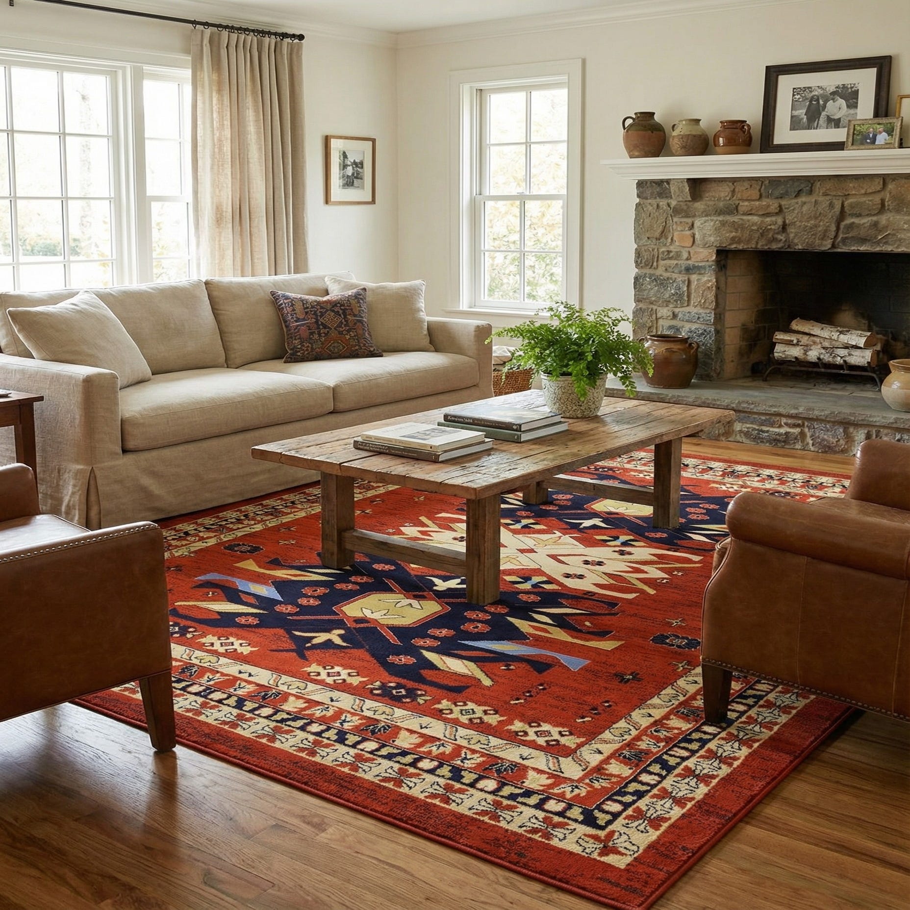 This palette and pattern work well where you want color and pattern without overwhelming a room: pair it with a leather sofa and natural wood pieces for a warm, grounded living room, set it beneath a dining table to anchor a casual yet refined dining area, or place it in a home office to introduce visual interest against neutral furnishings. It also complements eclectic and boho interiors when layered with textured throws and woven accents, and ties into coastal or traditional schemes through its light-blue and cream highlights.