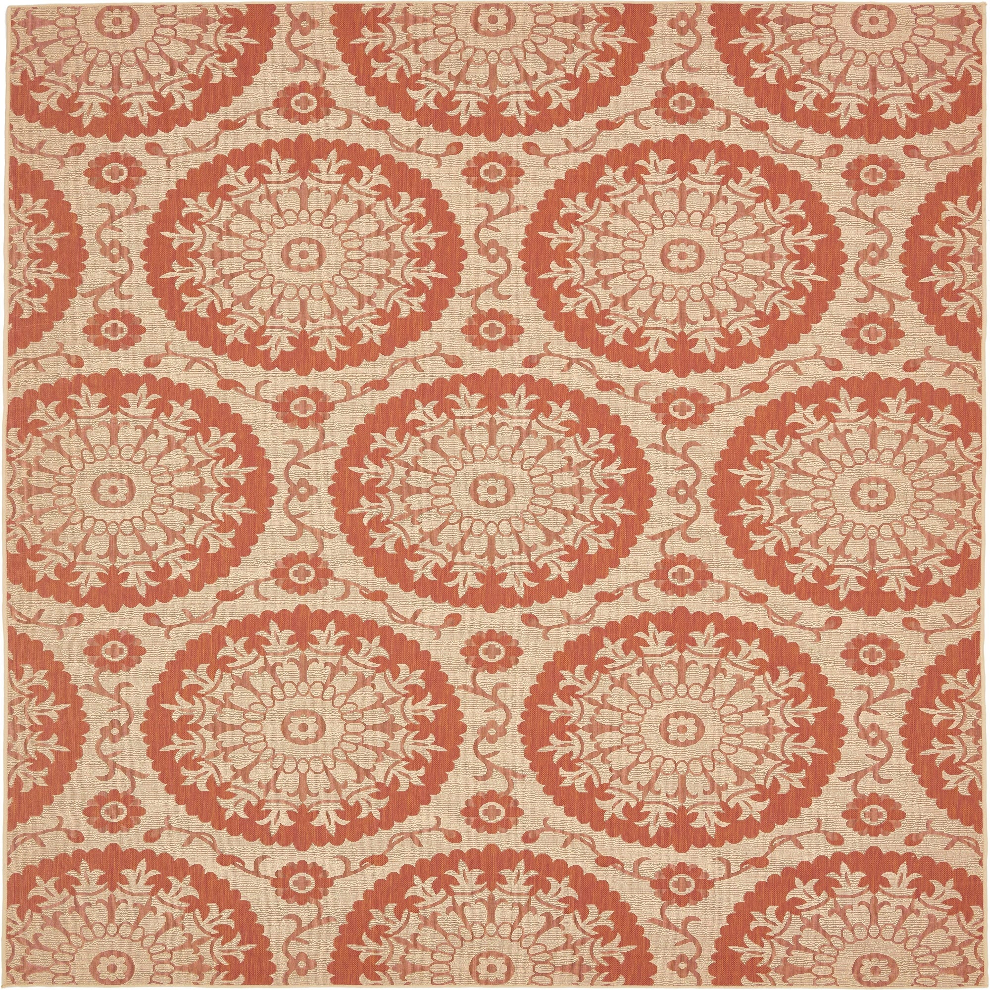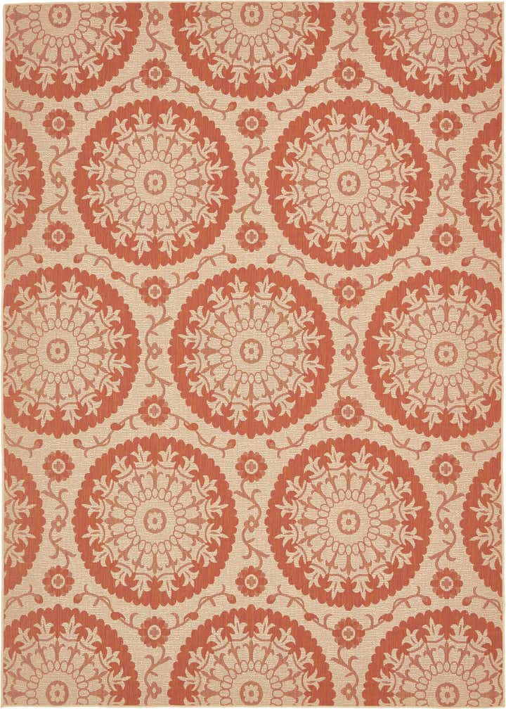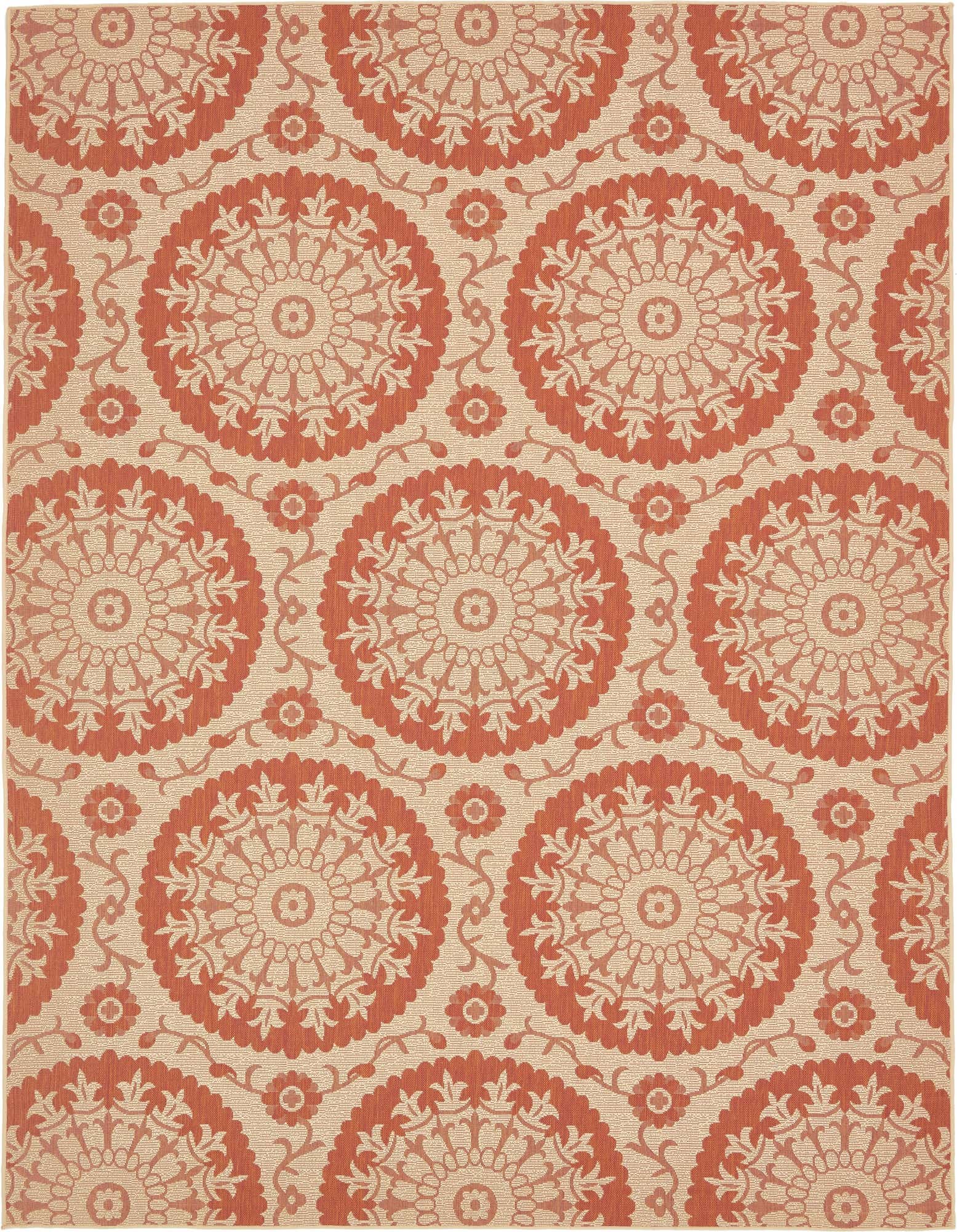 From the Outdoor Botanical collection, this 9x12 rug presents a striking terracotta and beige color palette, enhancing any outdoor or indoor space with its vibrant hues. The terracotta background sets a warm and inviting base, with the beige contributing a neutral contrast that highlights the detailed botanical pattern. The design features ornate medallions and floral motifs, delivering a classic yet fresh aesthetic that is versatile for various decor styles.