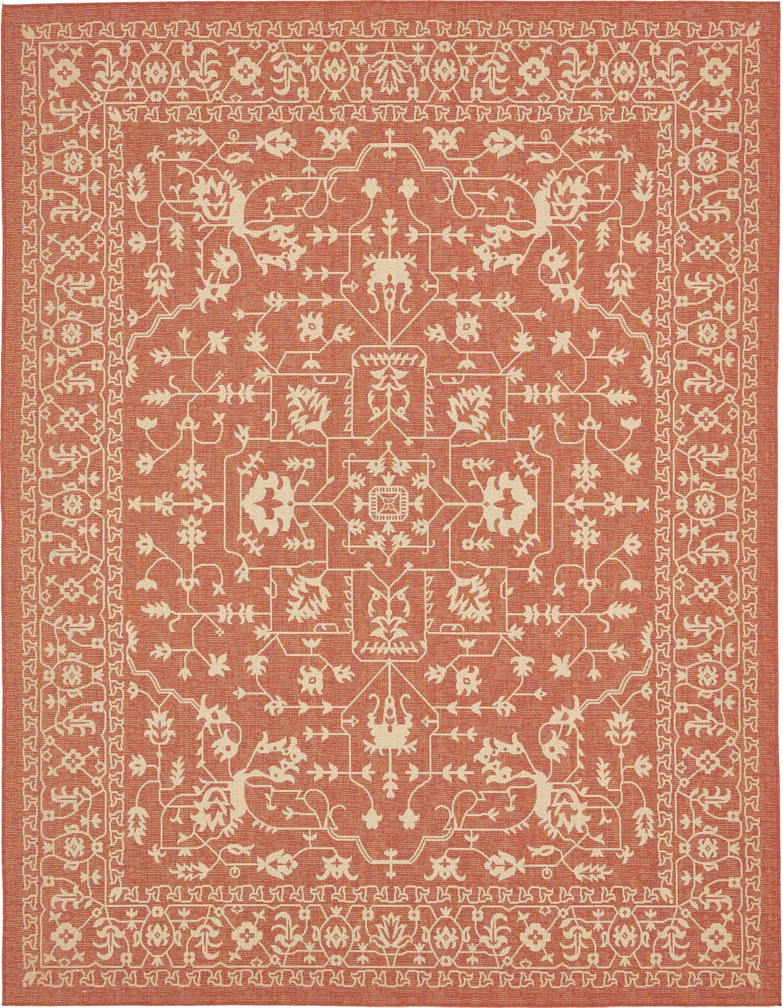 The Outdoor Botanical Collection offers a durable and stylish 9x12 area rug, machine woven of 100% polypropylene. This rug features a terracotta background, imbued with a botanical pattern in complementary beige accents. The design showcases an array of floral and foliage motifs, arranged in a symmetrical layout with a visible border, creating an elegant aesthetic ideal for outdoor spaces.