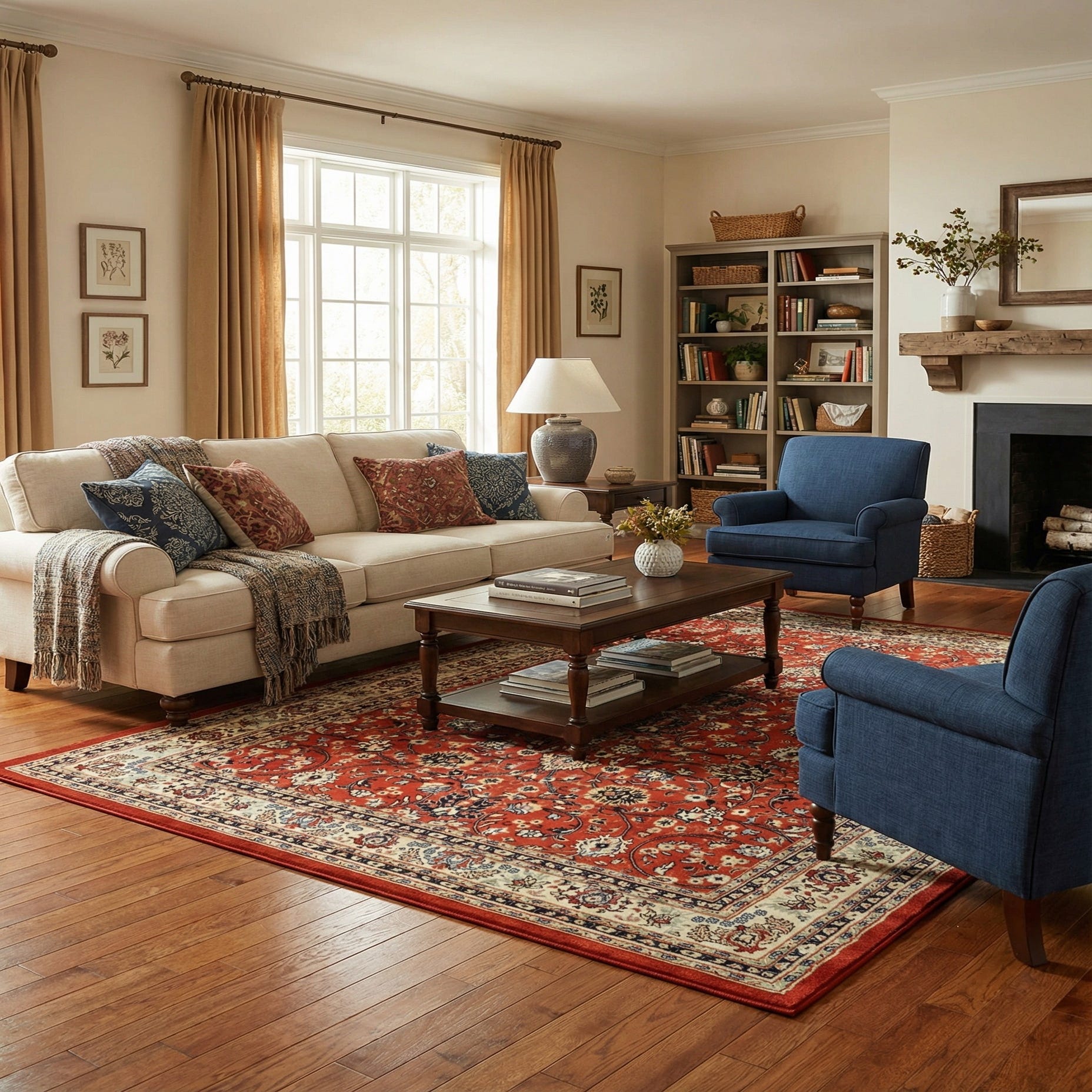 This rug brings grounded color and classic patterning to a variety of rooms: place it beneath a living room seating group to anchor a sofa and chairs, under a dining table to add warmth to mealtimes, or in an entry or study for an inviting first impression. It pairs especially well with warm wood tones, cream or linen upholstery, navy accents, and brass or aged metal finishes—use navy throw pillows or light-blue ceramics to pick up the cooler tones, or leather and rust-hued textiles to enhance the terracotta and orange notes.