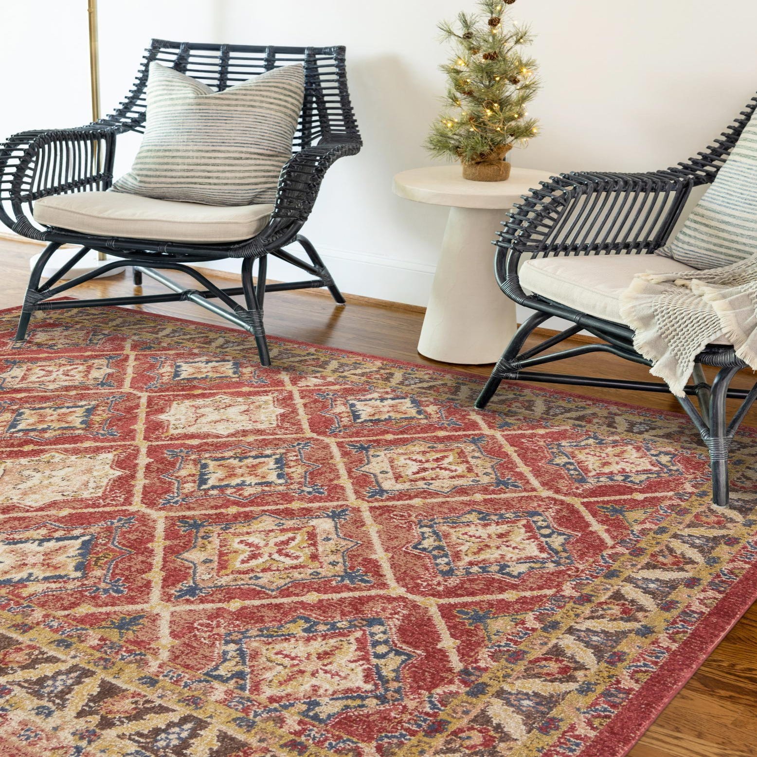 Primary color is Terracotta. Colors in this rug include: Terracotta, Blue, Brown, Burgundy, Cream, Gold, Navy Blue, Peach.
