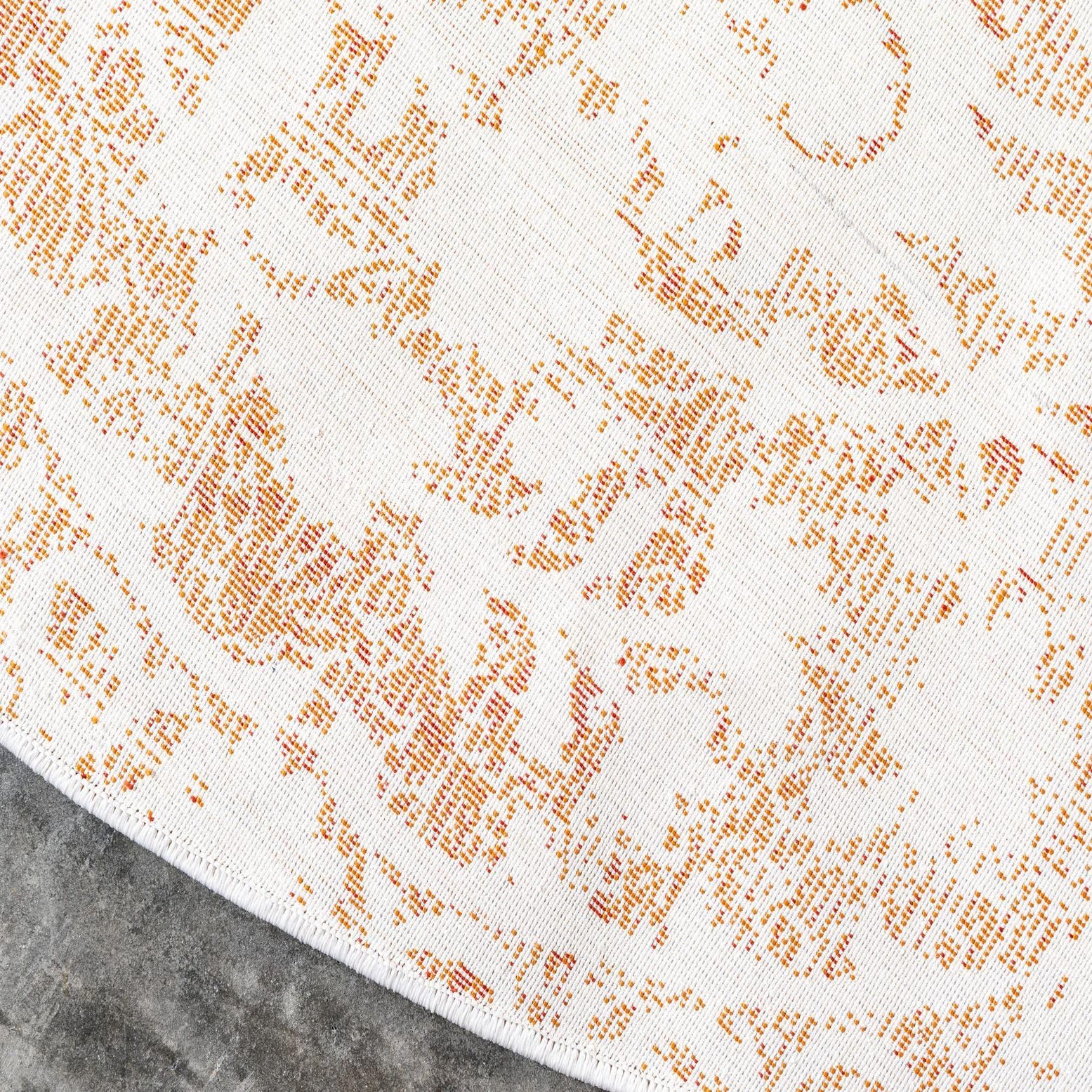 From the Modern Classical collection, this machine-woven round rug is crafted from a durable blend of 70% Polypropylene and 30% Polyester, ensuring longevity and ease of maintenance. The design showcases a rich terracotta background with an intricate ivory pattern, reminiscent of traditional motifs reimagined for contemporary tastes. The pattern provides a sense of depth and elegance, while the rug's texture adds a tactile dimension to its visual appeal.