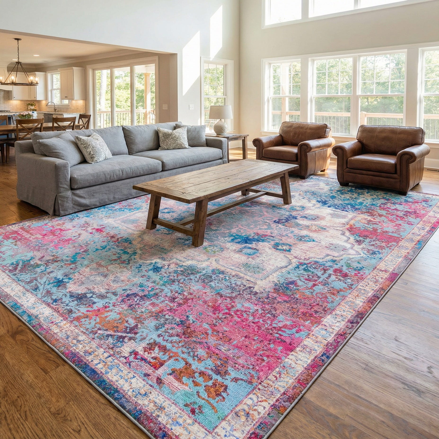 This rug works well as a colorful anchor in a living room or family room, underneath a seating group to tie together neutral sofas and bright accents. It pairs easily with coastal or bohemian interiors as well as eclectic contemporary rooms—try it with whitewashed woods, mid-century furniture, or layered over a natural-fiber rug for added depth. It also brings a warm, creative touch to a bedroom, playroom, or studio where a lively, yet softened palette is desired.