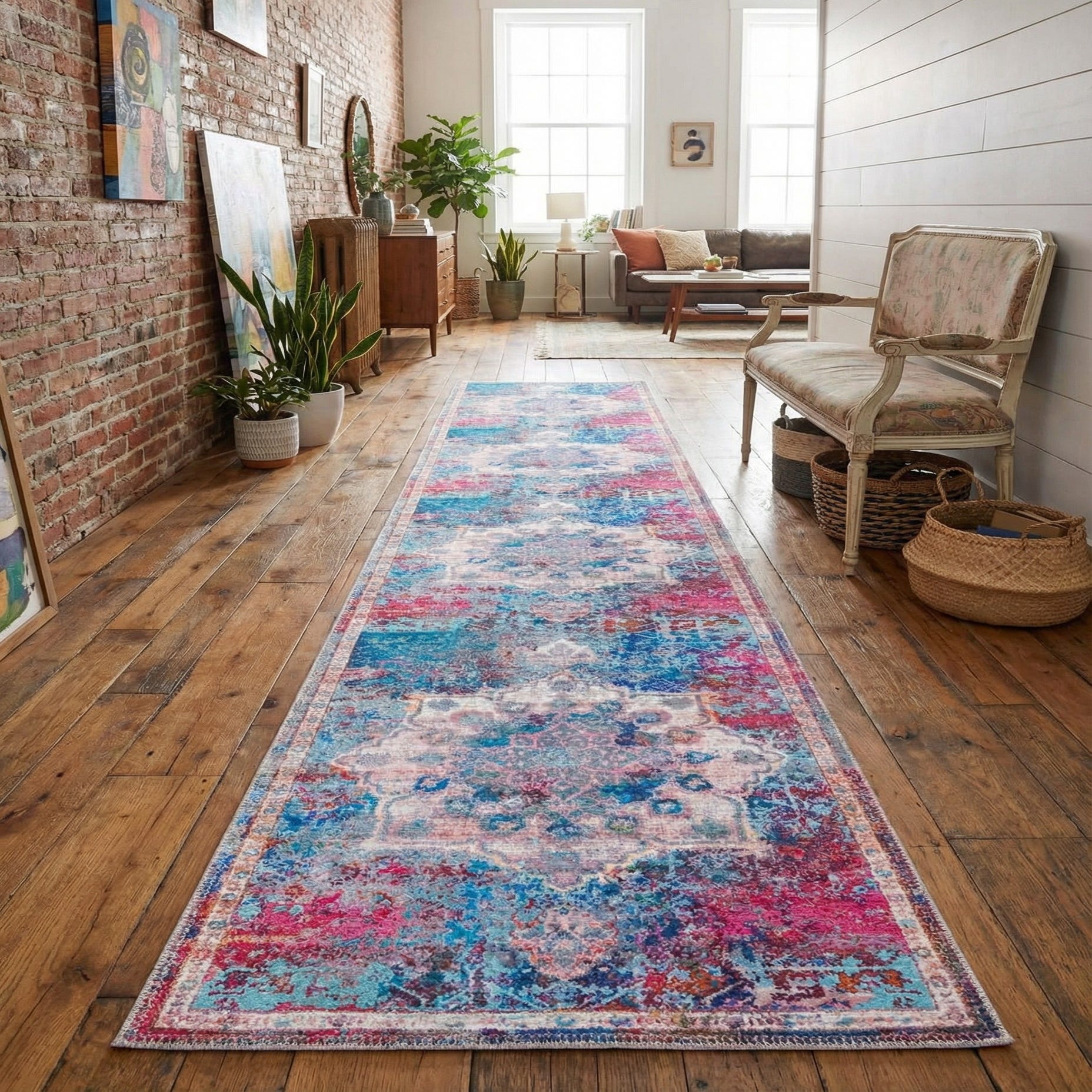 Ideal for narrow, active zones, this runner brings color and pattern to hallways, entryways, and beside a bed or sofa. It complements eclectic and bohemian interiors, adds a lively layer to coastal or contemporary schemes with white or neutral furnishings, and provides a colorful counterpoint in transitional or mid-century modern rooms.