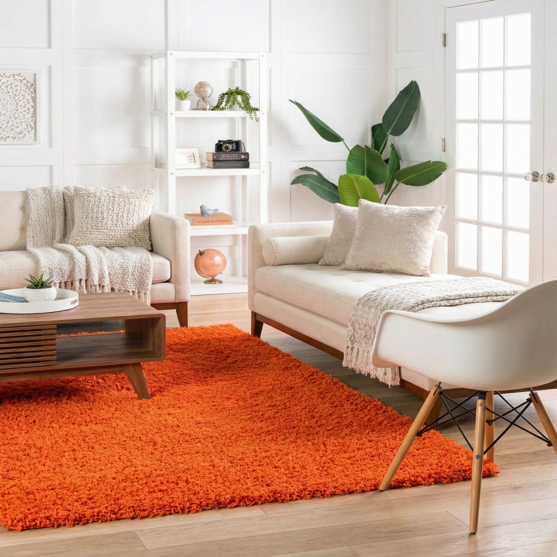 A solid, high-pile shag in a bold Tiger Orange, this rug delivers a single, saturated field of color with no pattern to distract from its tactile presence. Machine made from 100% polypropylene, the long cut strands form a deep, plush surface that springs underfoot; running your hand across the pile reveals a soft, slightly tousled texture with plenty of dimension from the twisted yarns. The solid construction keeps the look clean while the shag silhouette adds a relaxed, cozy feel.
