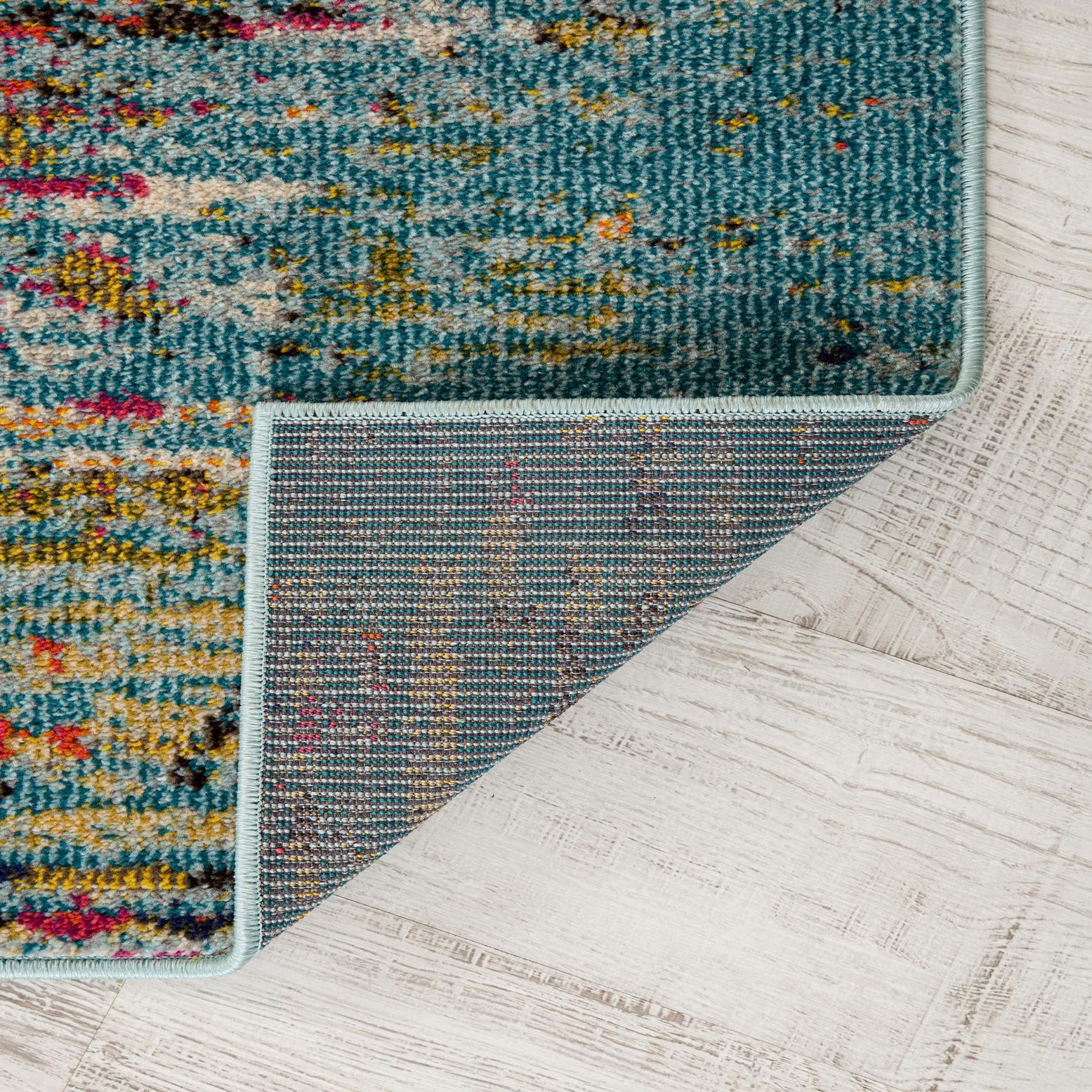 A row of softened medallions runs the length of this runner, set on a turquoise ground that anchors the design. The pattern has a painterly, slightly distressed quality—layers of cream, yellow, orange and red blend into one another with navy blue and olive flecks that add depth and contrast. Machine made of 100% polypropylene, the rug’s dense, low?profile weave offers a softly cushioned hand and a textured surface that shows the color variation like a worn heirloom.