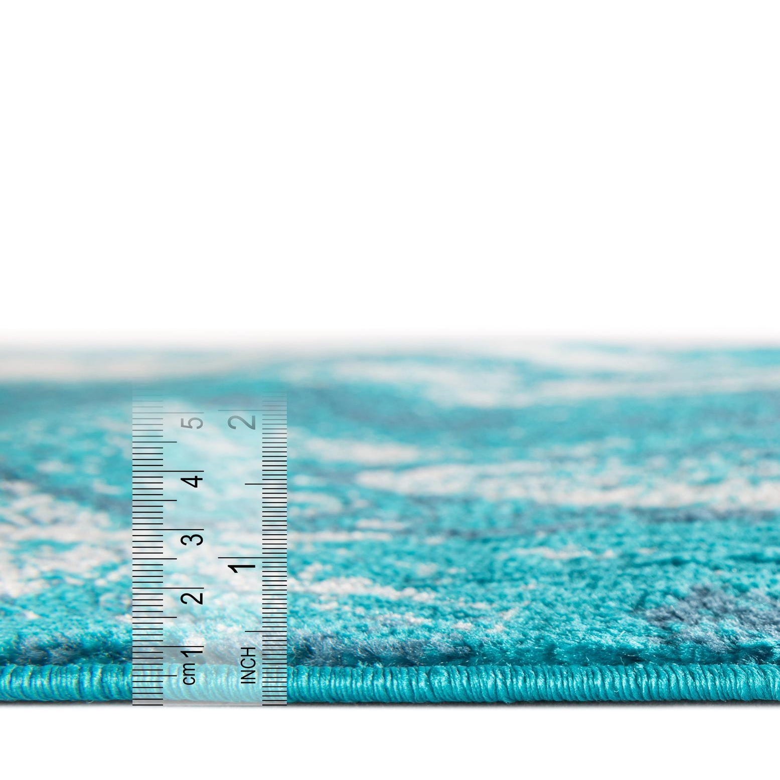 A striking runner with a vibrant turquoise background, this rug displays a mirrored, abstract medallion motif in deep blue and ivory. The design has a watercolor-like, distressed finish with organic edges and layered color transitions that give the pattern depth and movement. Underfoot the surface feels smooth and low-profile, the pile offering a soft, slightly cushioned hand while maintaining a clean, uniform appearance.