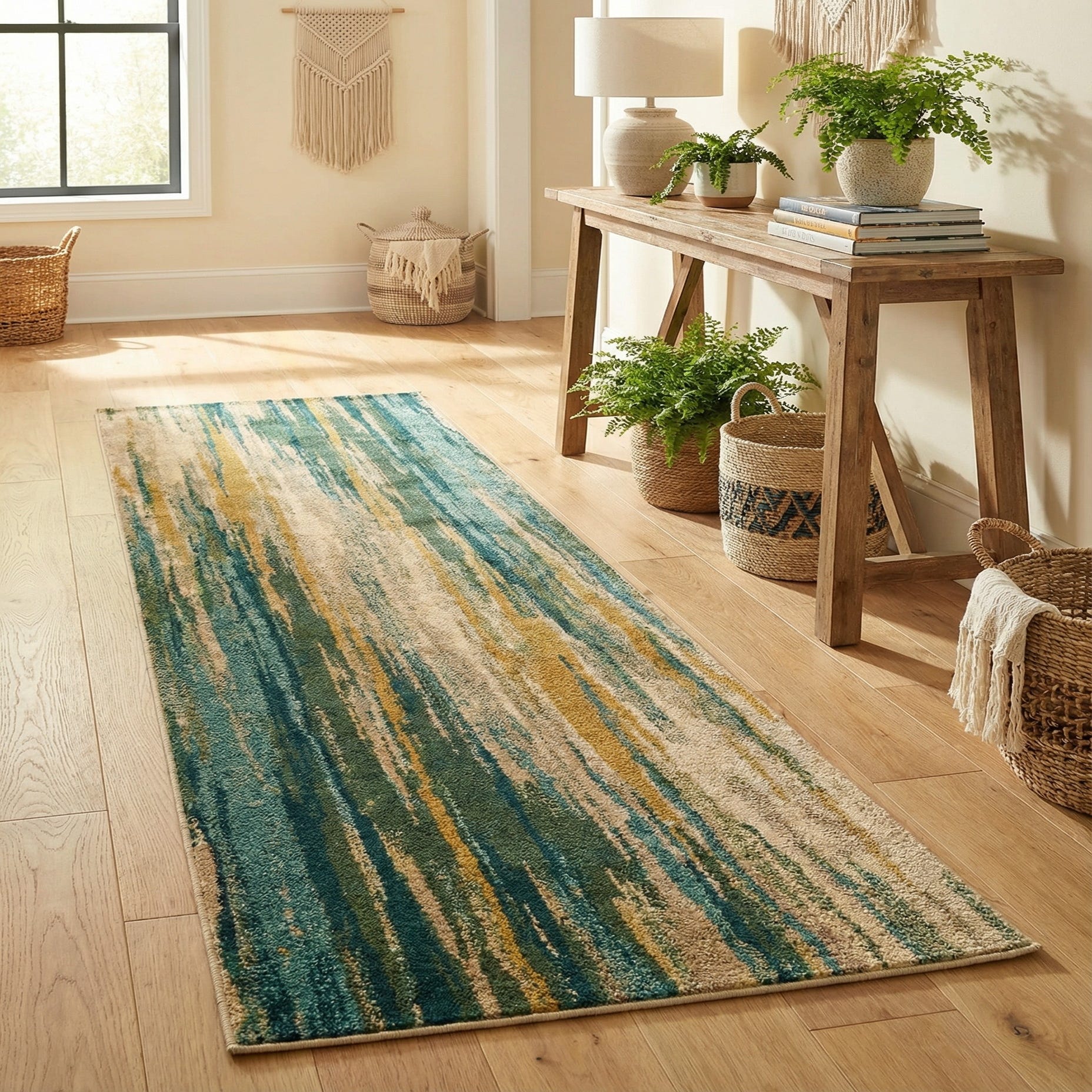 Designed for narrow spaces, this runner brings color and movement to hallways, entryways, galley kitchens, or alongside a bed. It pairs naturally with light oak or walnut floors and neutral furnishings in ivory or gray, and it complements contemporary, transitional, mid-century modern, or coastal-inspired interiors. Add brass or matte-black metal accents and a few leafy plants to pull out the green and olive tones, or keep the palette calm with linen textiles to let the turquoise and yellow accents take center stage.