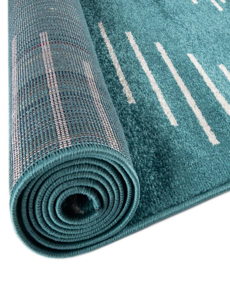 A graphic, modern rug with a bold turquoise field punctuated by crisp ivory linear stripes arranged into a large central diamond and smaller corner motifs. The horizontal lines create a sense of movement and clean geometry that suits contemporary and midcentury settings. Machine made of 100% polypropylene, the surface has a low, velvety pile that feels soft underfoot while keeping a neat, tailored look.